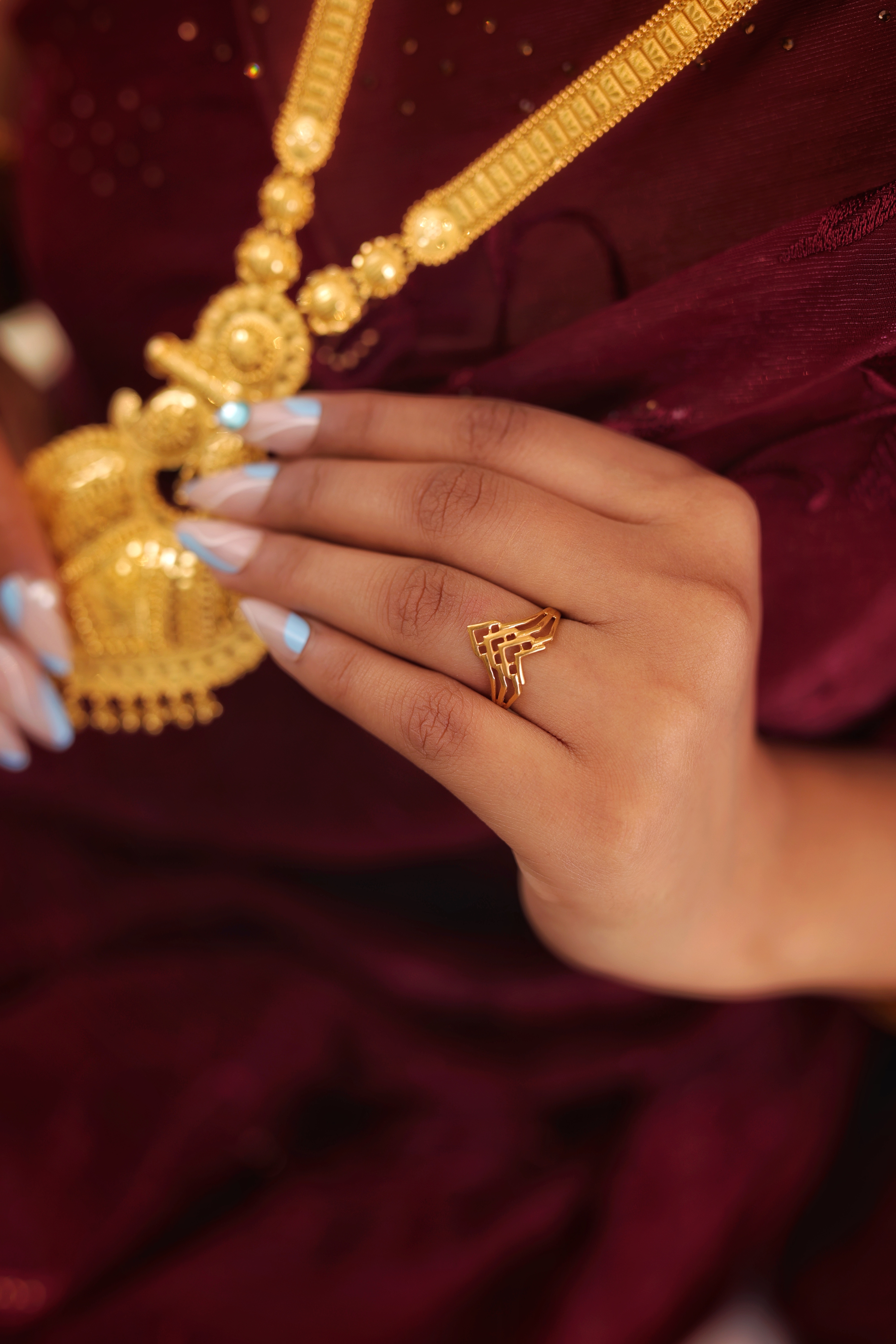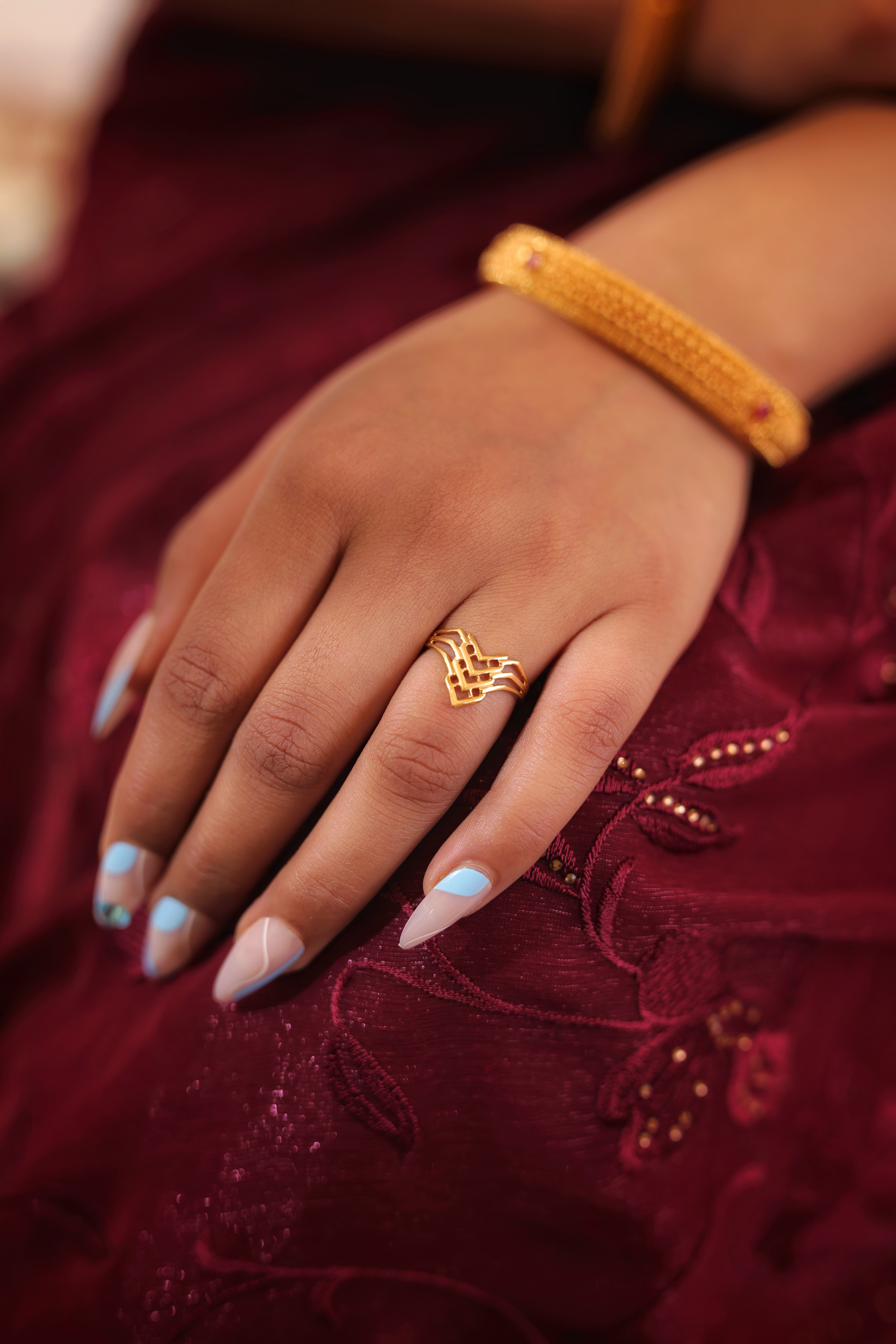 Key Features:Design: Prominent heart-shaped Ladies Casting Ring with a light, open geometric structure. Motif: Heart outline filled with layered and intersecting polished gold wires. Finish: Smooth, high-polish finish that highlights the linear, openwork design. Metal Purity: 22 Carat Yellow Gold (916 purity). Usage: Ideal for daily wear, as a love token, or for lightweight festive occasions.
