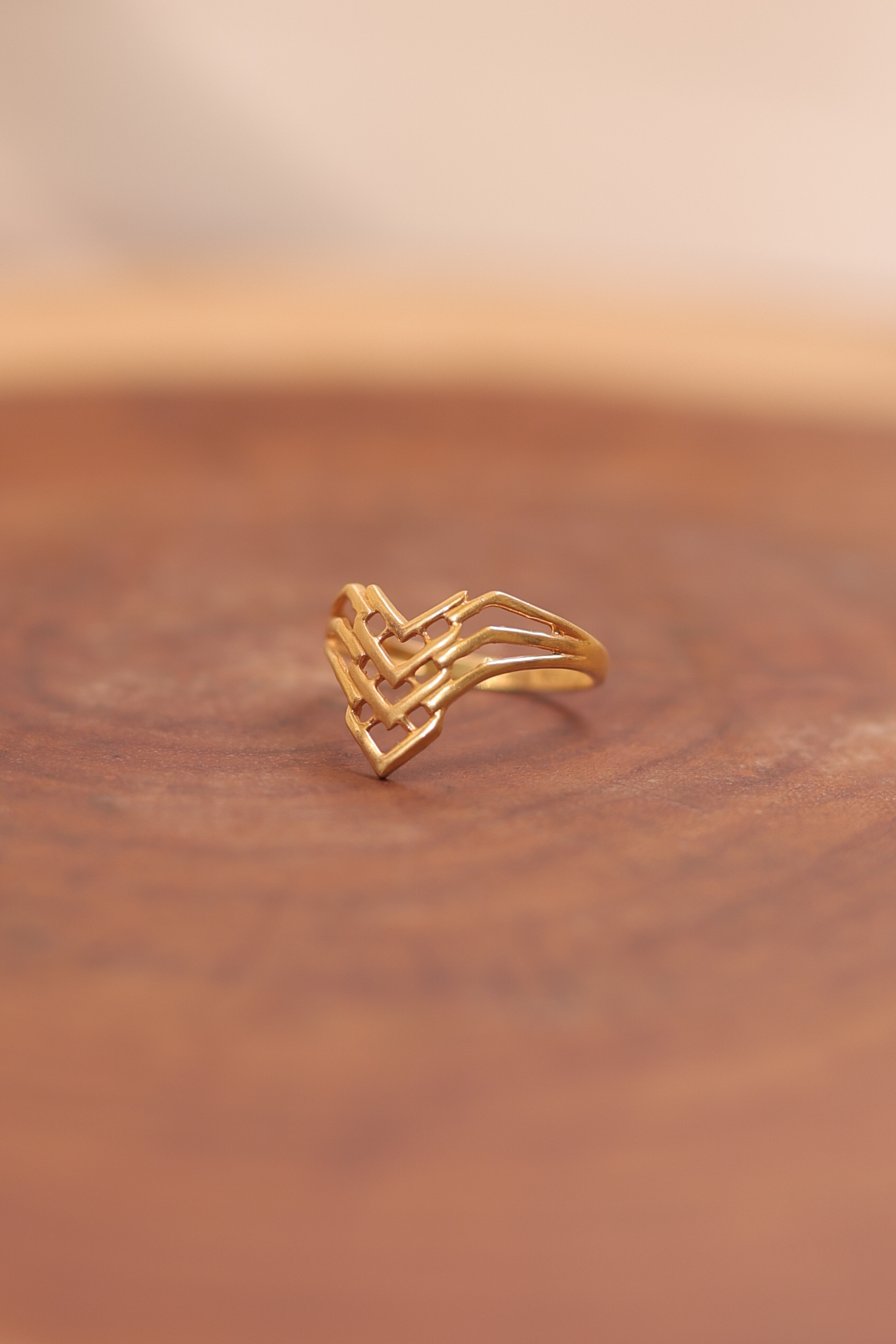 A modern and lightweight ladies ring featuring a prominent heart-shaped top crafted from multiple layers of sleek, open gold wire creating a lattice or woven effect.
