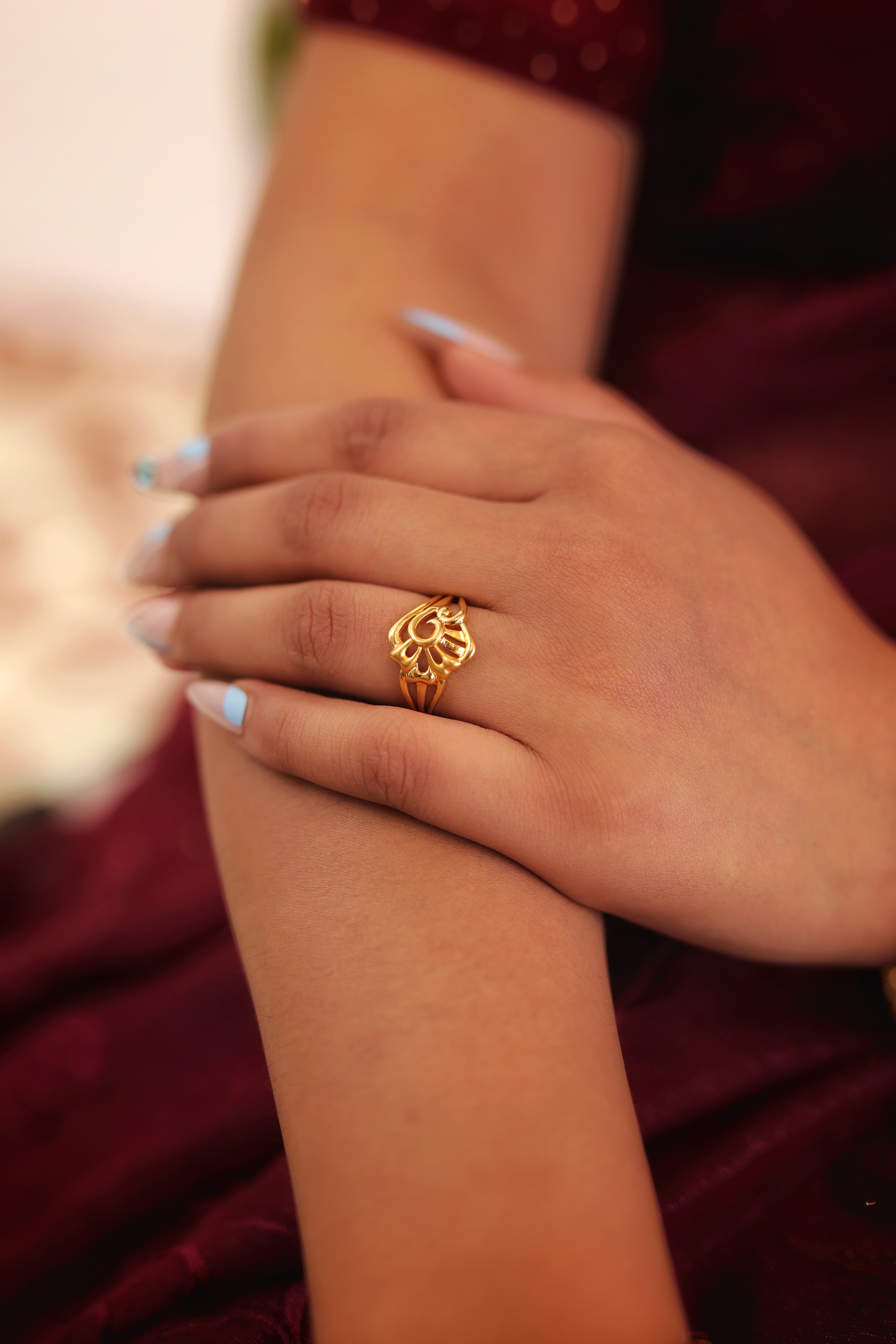 Key Features:Design: Broad, sculptural Ladies Casting Ring with a prominent abstract floral or scroll motif. Motif: Intertwining polished gold ribbons forming openwork petals, loops, or fan shapes. Finish: Smooth, high-polish finish, highlighting the dramatic curves and dimension. Metal Purity: 22 Carat Yellow Gold (916 purity). Usage: Ideal as a distinctive statement ring for festive occasions or sophisticated daily wear.