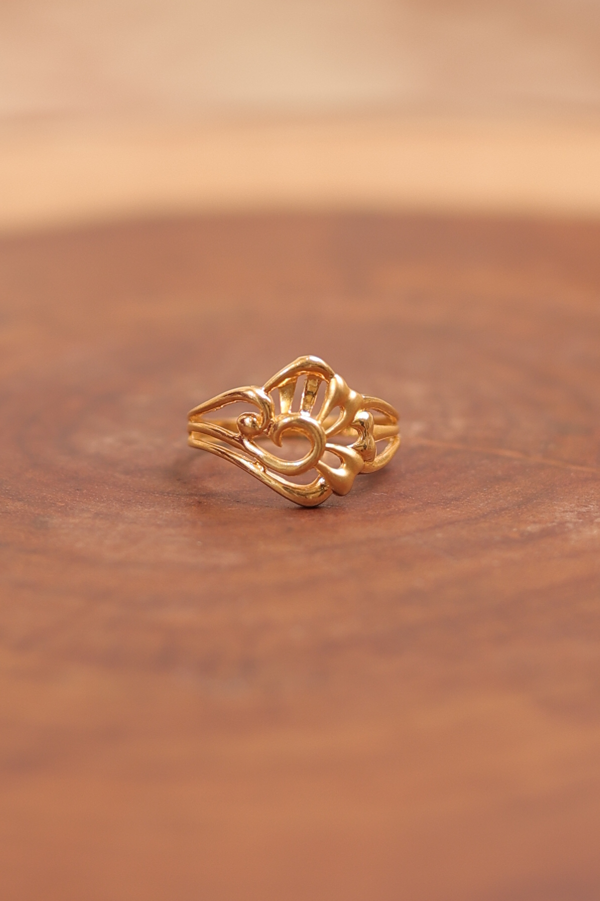 This beautiful ladies ring showcases an elaborate, three-dimensional design with a focus on graceful, curving lines, achieved using the Casting method for a smooth, high-detail finish. It is crafted in rich 22-carat yellow gold (916 purity).