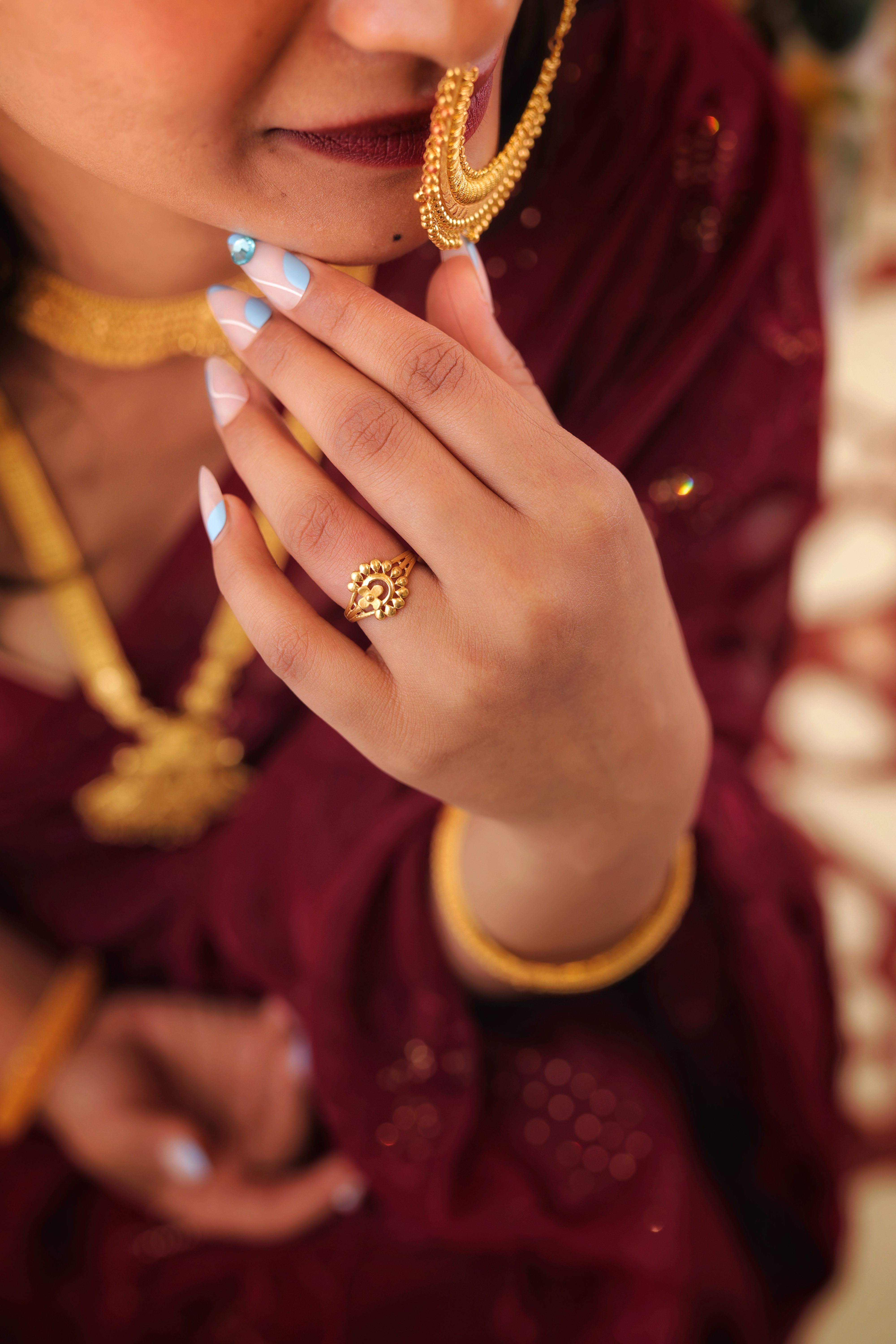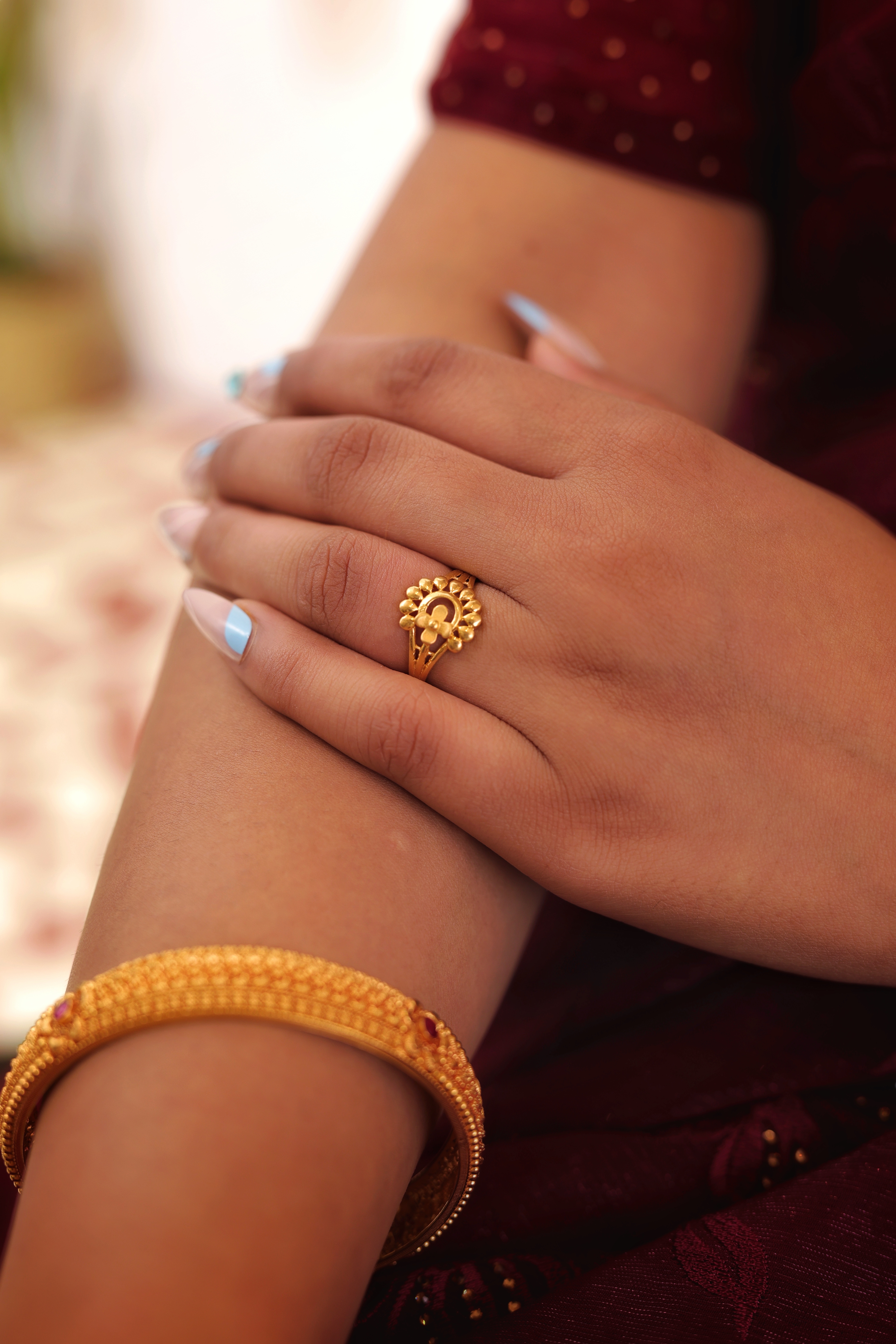 Key Features:Design: Broad, circular Ladies Casting Ring with a sunburst/floral motif. Motif: Central crescent and flower surrounded by a border of teardrop/petal elements. Details: The outer petals feature a subtle textured or matte finish. Metal Purity: 22 Carat Yellow Gold (916 purity). Usage: Ideal for daily wear, festive occasions, or as a graceful statement piece.