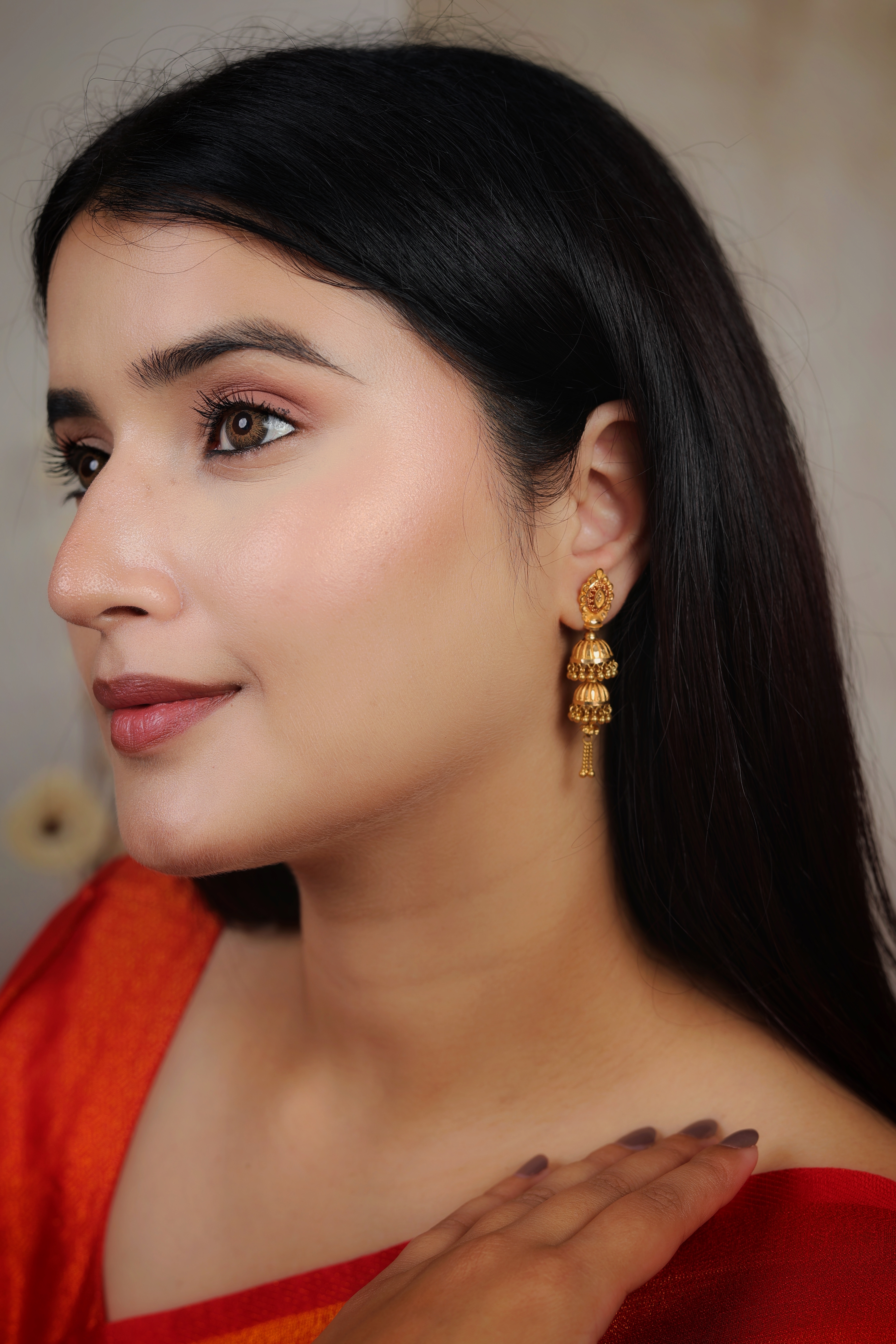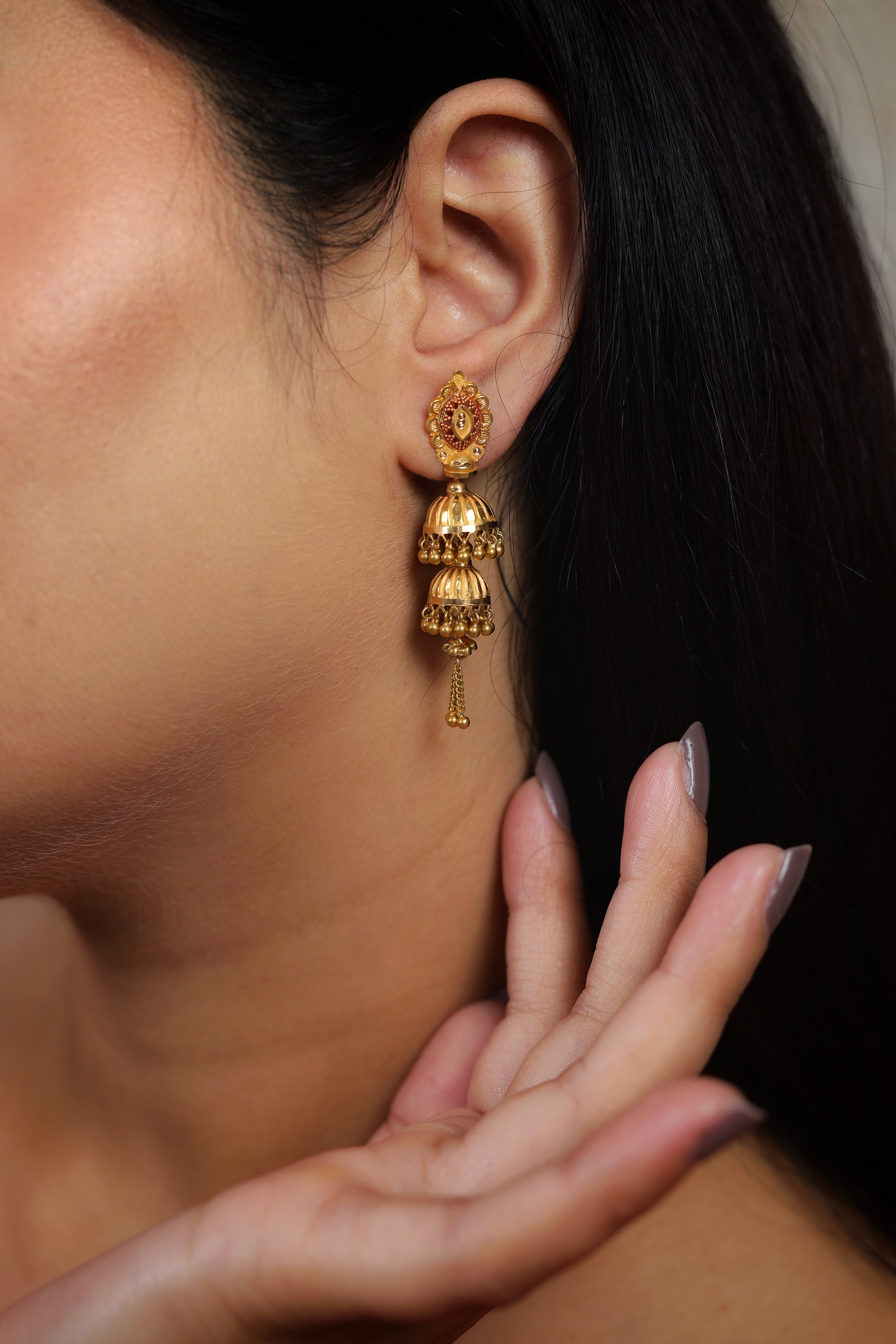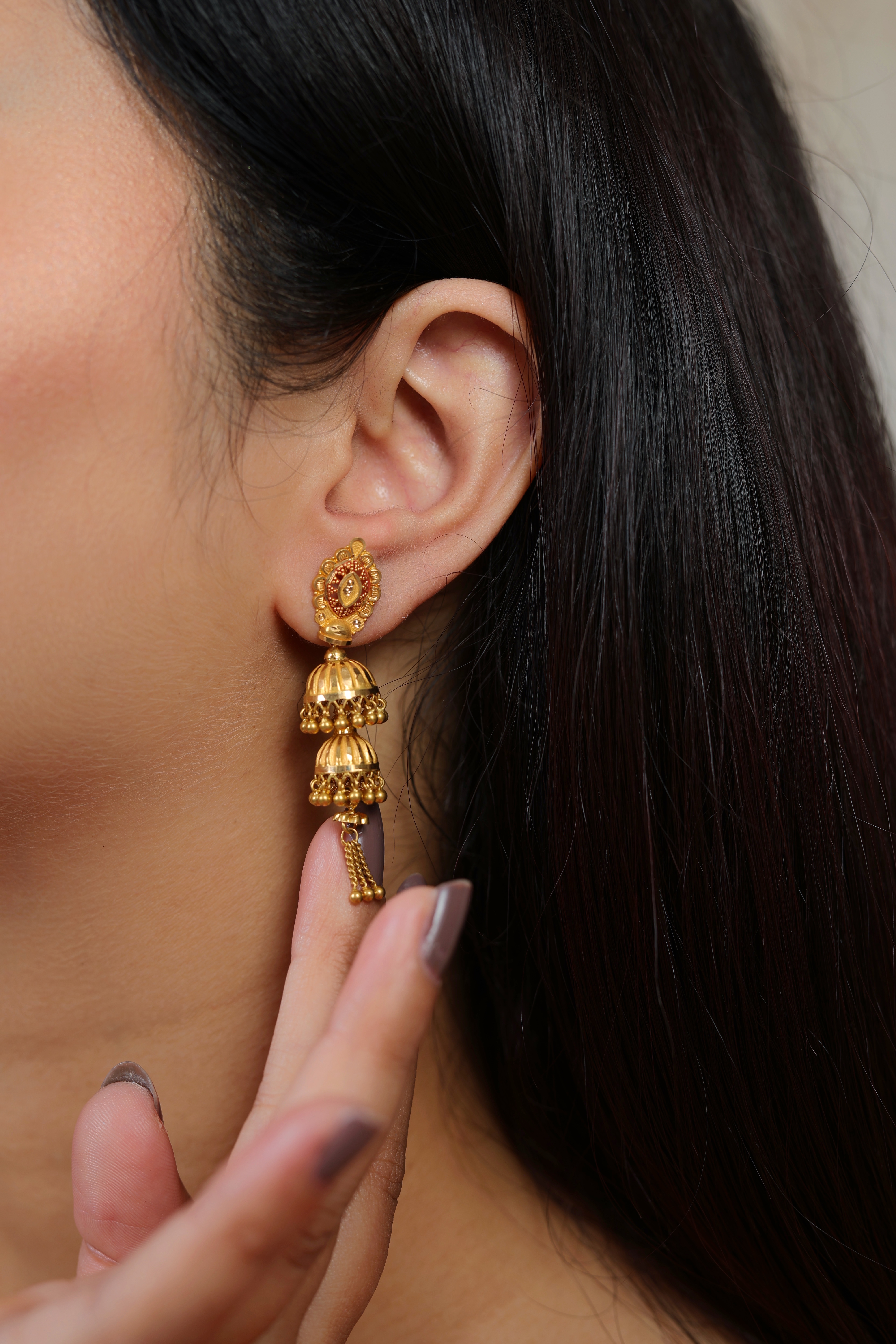 Key Features:Design: Large, ornate Jhumki style with a dramatic double-bell tiered drop. Motif: Highly detailed circular stud with fine wirework; textured, layered bells. Drop: Each bell is accented with dangling ghungroo beads. Metal Purity: 22 Carat Yellow Gold (916 purity). Usage: A luxury statement piece for bridal wear, grand festive occasions, and elaborate traditional ceremonies.