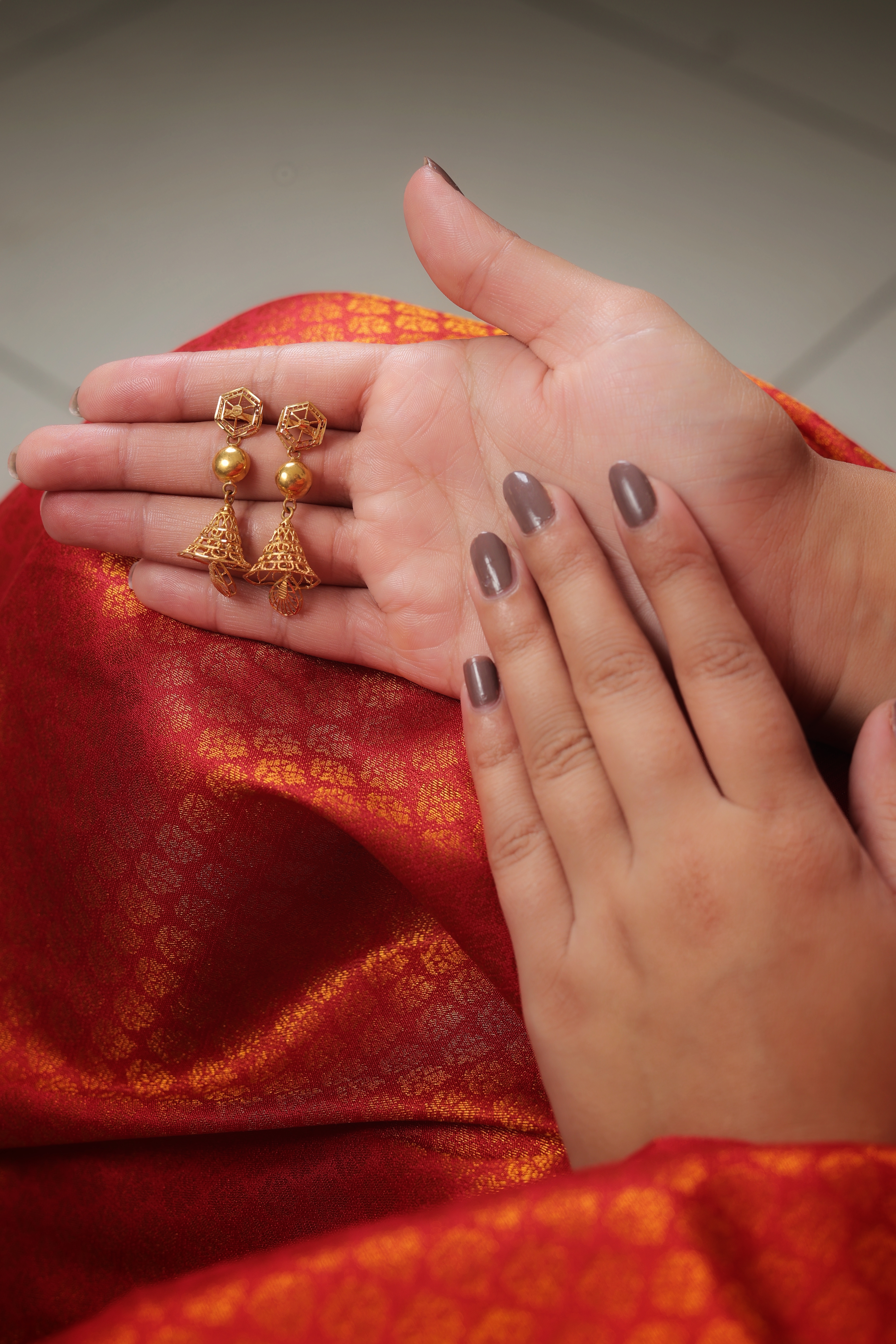 The Bell (Jhumka): The drop is an inverted bell shape with a light, airy feel due to its intricate openwork pattern. This pattern resembles fine latticework or delicate cutouts. The bottom edge of the bell is finished with small, polished gold drops, enhancing movement.