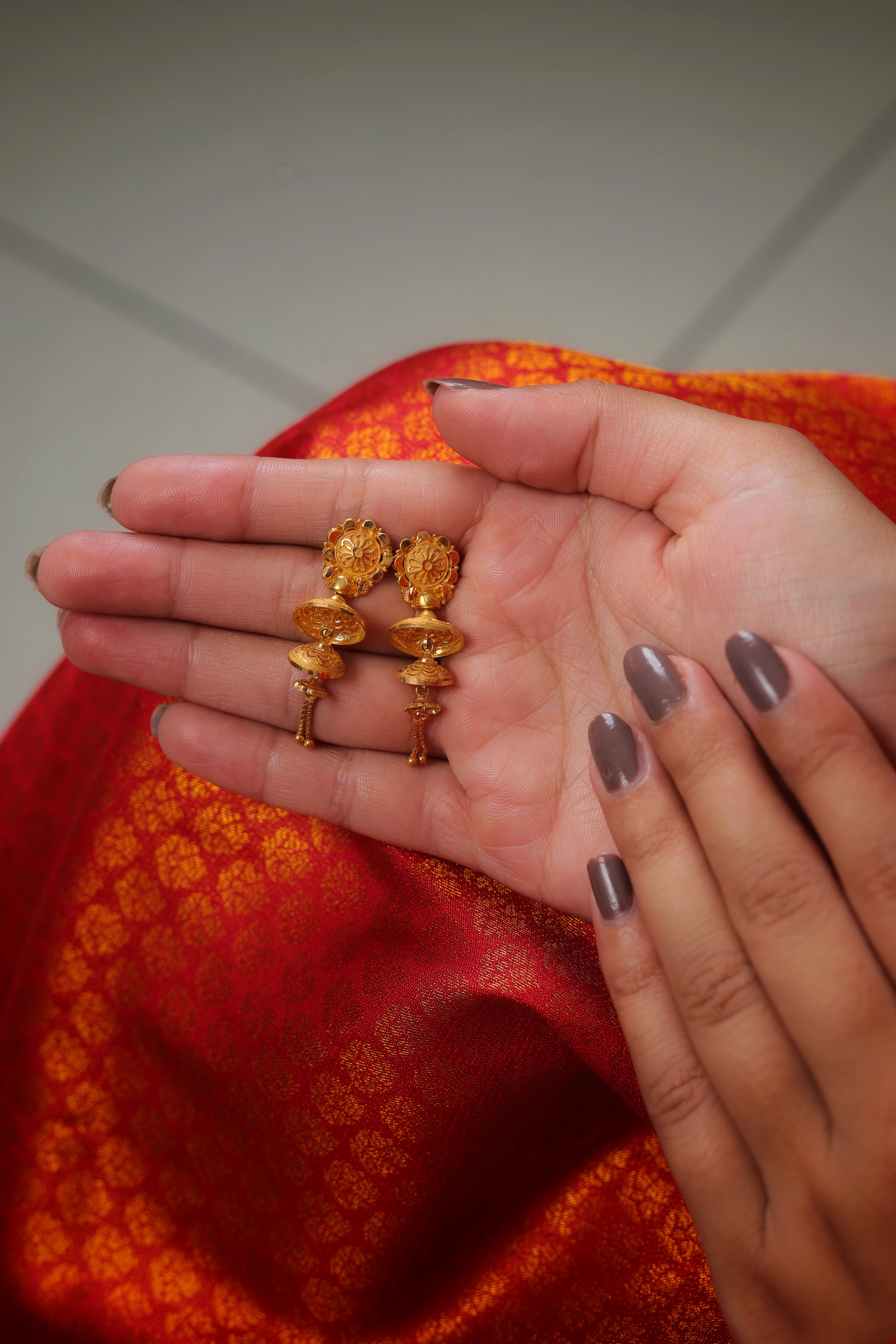 The Bells (Jhumkas): The drop consists of three separate, textured bells stacked vertically, decreasing in size from top to bottom. This tiered structure provides maximum traditional volume and visual depth. Each bell layer is separated by a small connecting element, and the bottom of the lowest bell is finished with small dangling gold drops or chain tassels.