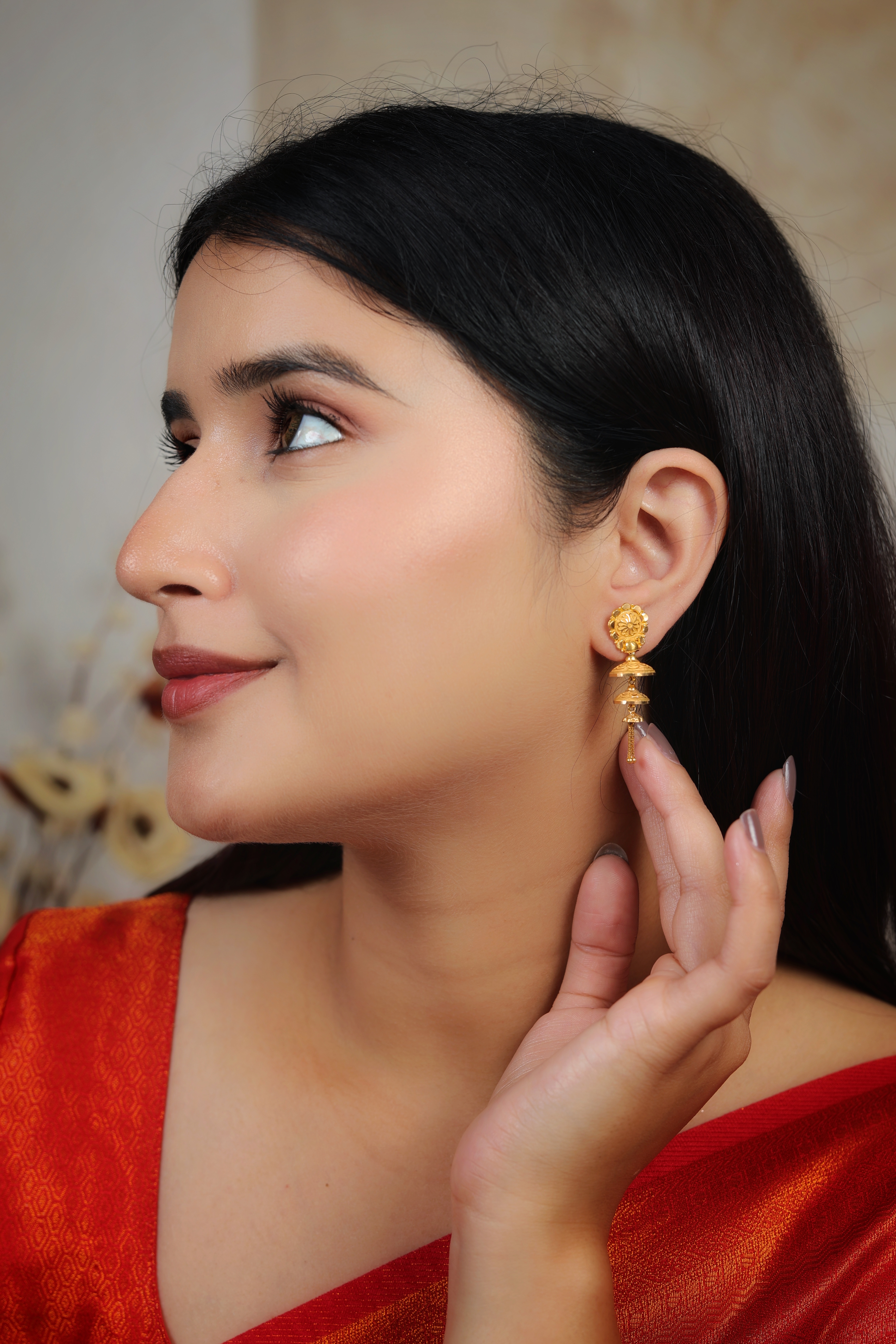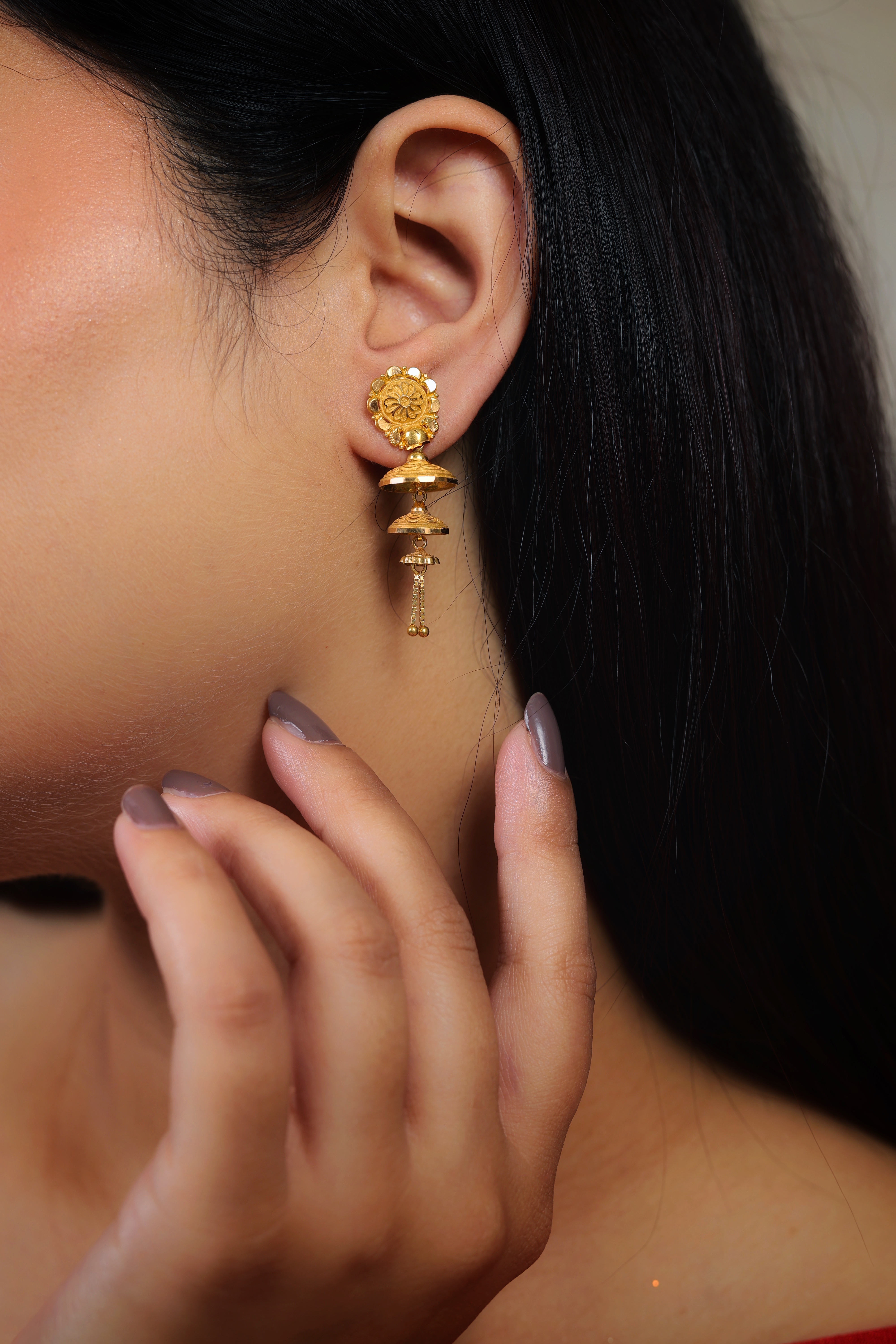 Key Features:Design: Highly traditional Jhumki style with a substantial, tiered structure featuring three distinct bell layers. Motif: Intricately decorated circular stud connected to the layered drop. Drop: Features three stacked bells with finely textured or patterned surfaces. Metal Purity: 22 Carat Yellow Gold (916 purity). Usage: A luxurious bridal accessory or a prominent piece for major festive and formal traditional occasions.