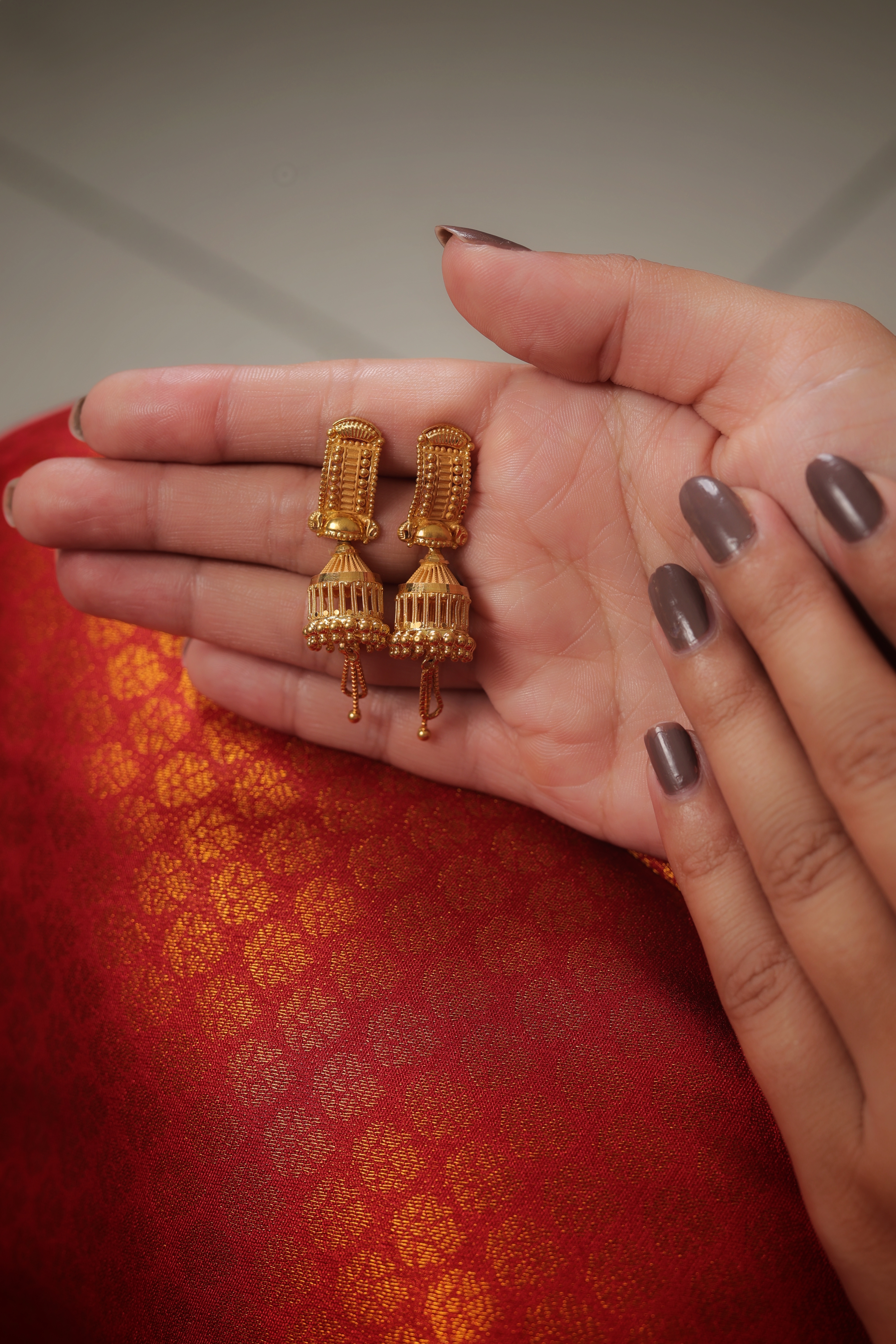These striking earrings offer a bold, structured take on traditional Jhumki design, crafted in rich 22-carat yellow gold (916 purity). The design moves away from organic floral motifs in favor of clean lines and architectural symmetry.