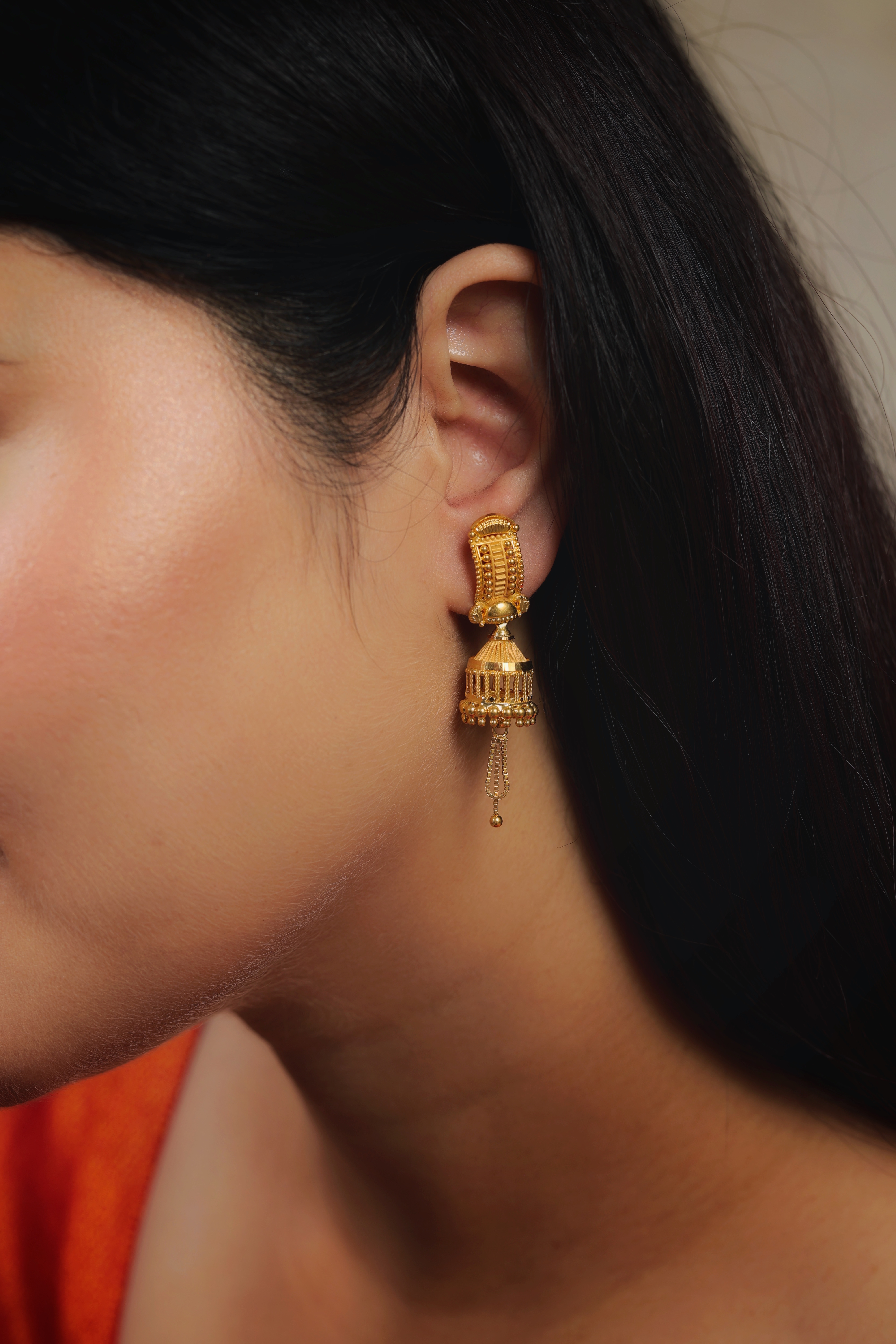 Key Features:Design: Modern-traditional Jhumki with a unique architectural pillar-style stud. Motif: Linear, ribbed gold work on both the stud and the cage-like bell. Drop: Features a border of small gold beads and central chain tassels. Metal Purity: 22 Carat Yellow Gold (916 purity). Usage: Perfect for high-end festive wear, formal traditional events, or as a contemporary bridal accessory.