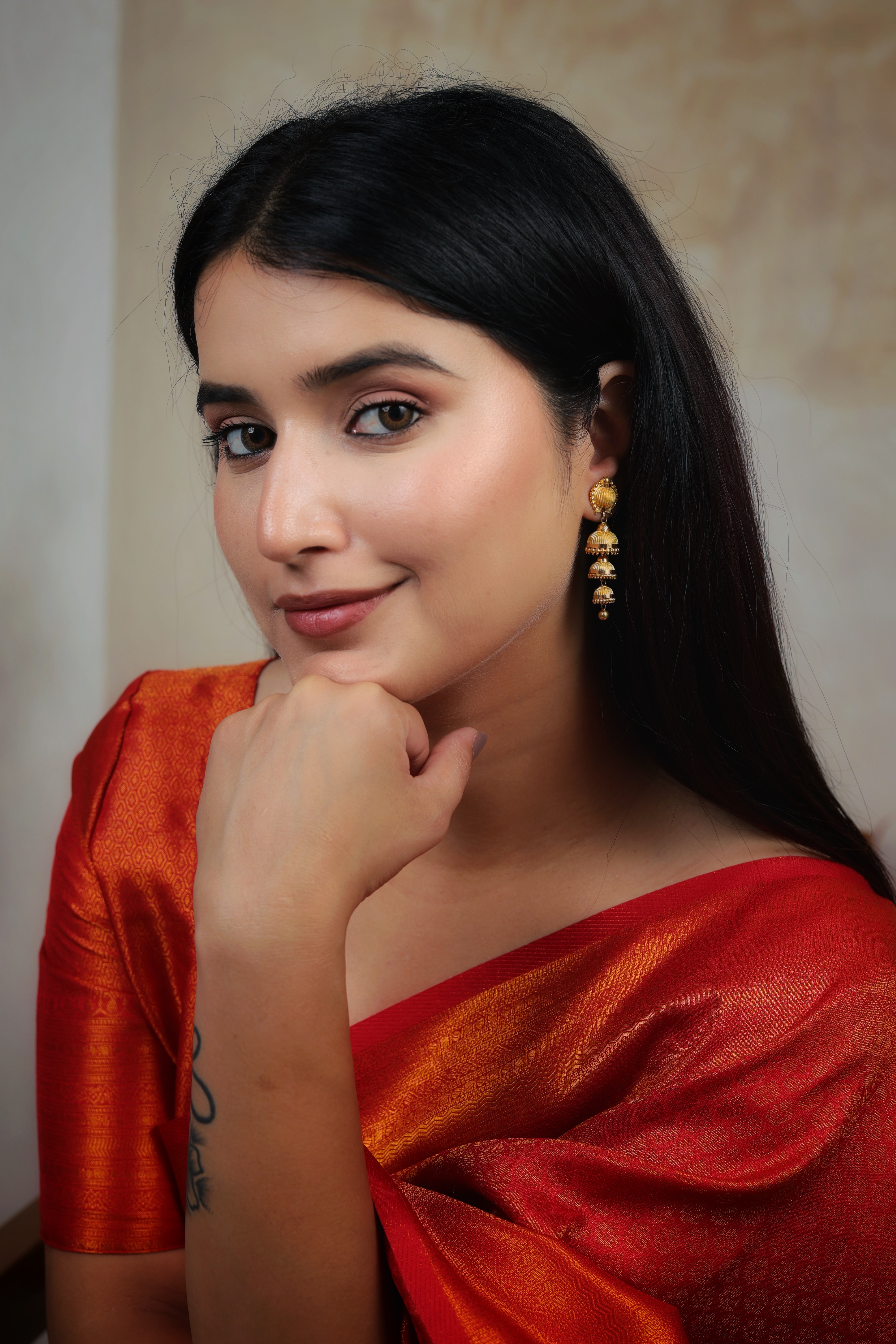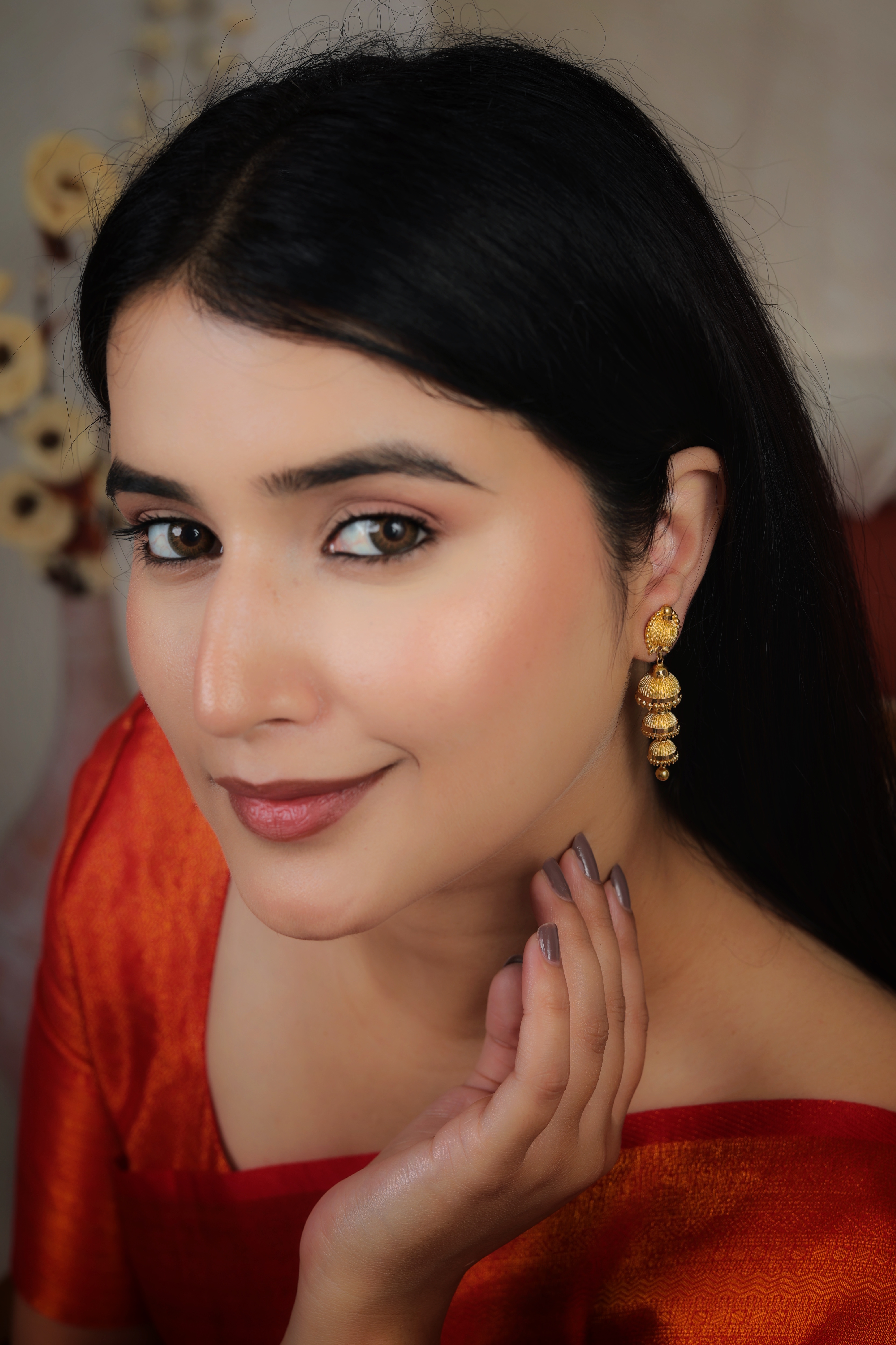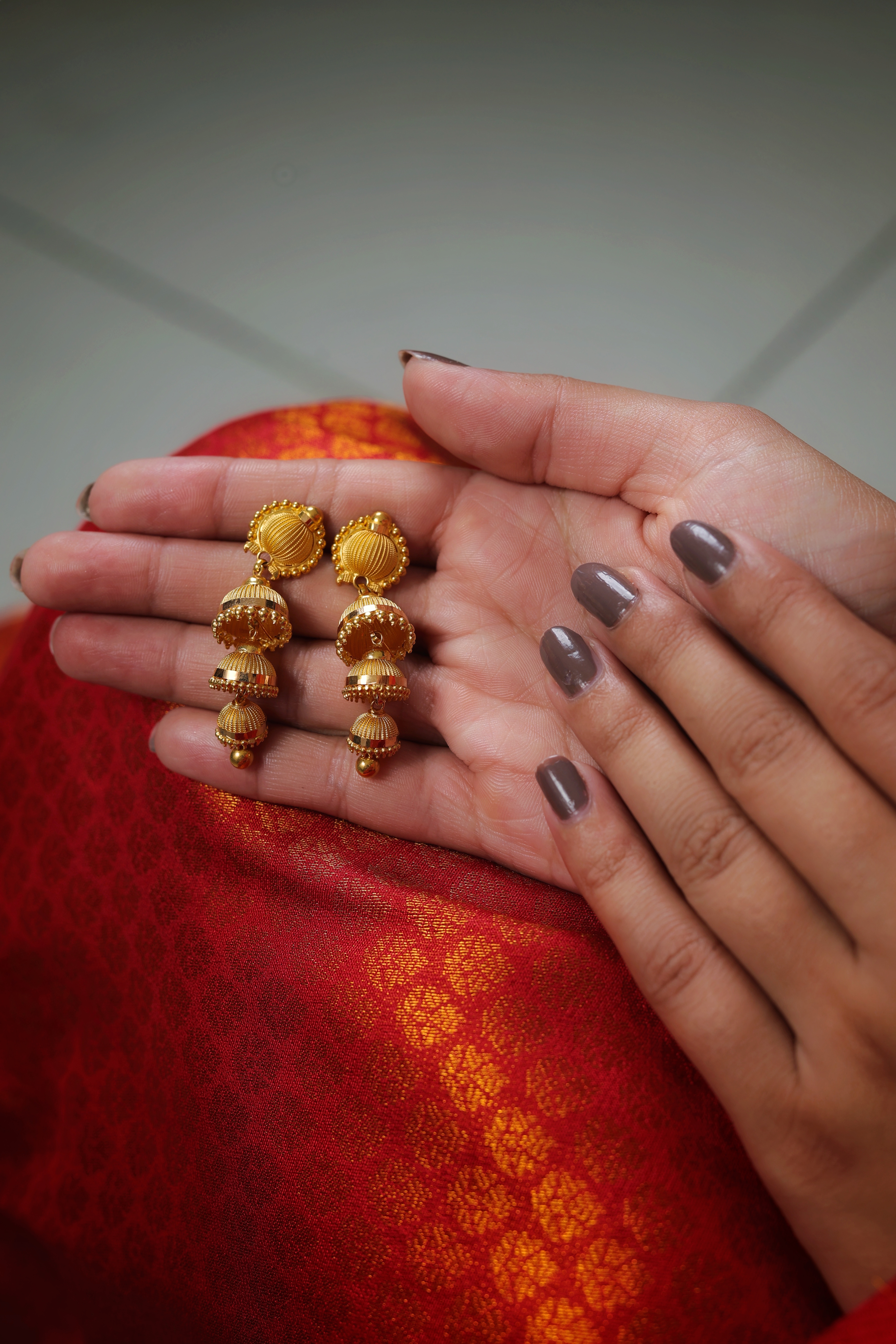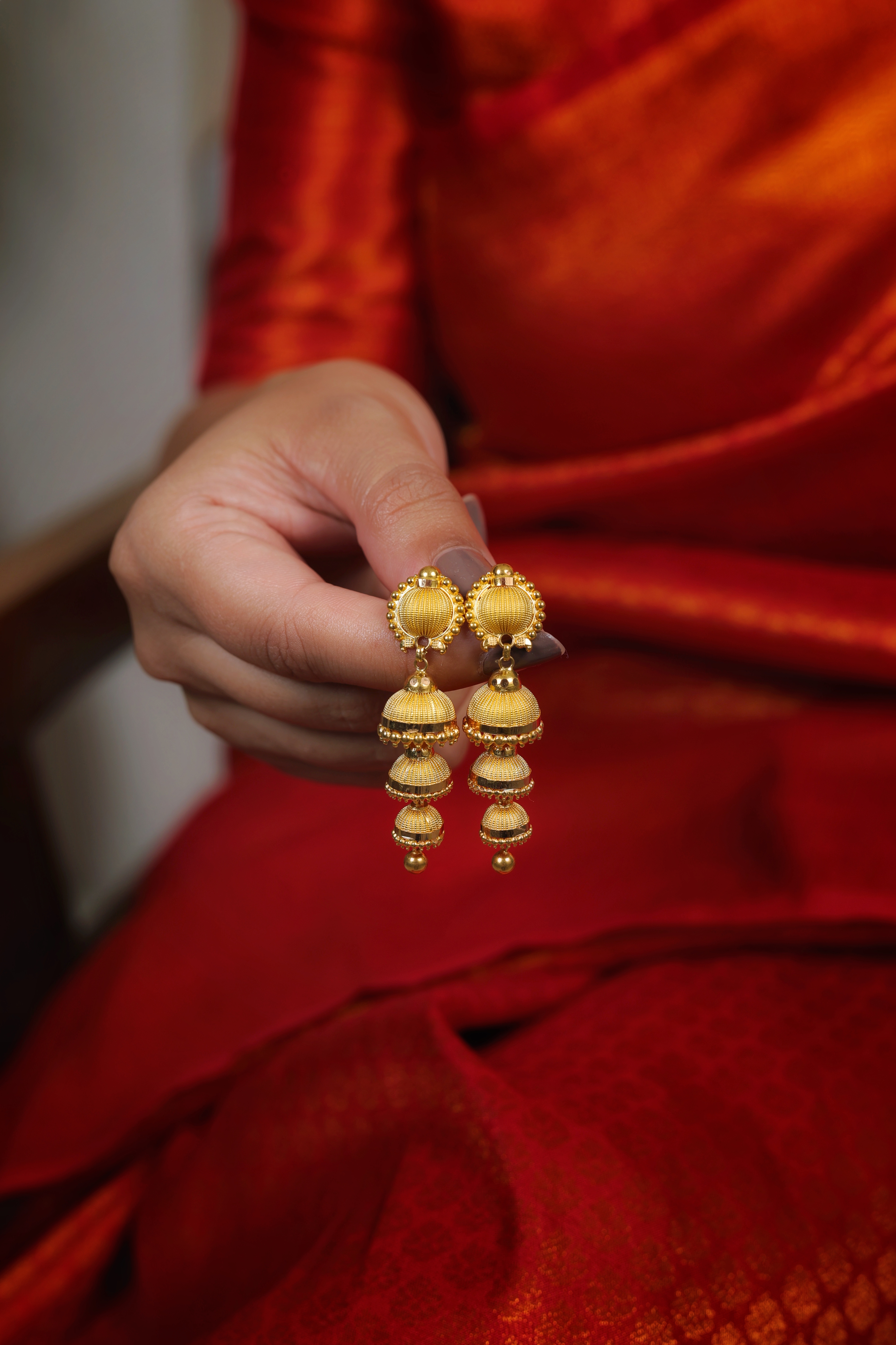 Key Features:Design: Highly traditional Jhumki style with a substantial, triple-tier stacked bell drop. Texture: Features extensive fine granulation and ribbed goldwork for an antique finish. Structure: Decreasing bell sizes create a graceful, tapering silhouette. Metal Purity: 22 Carat Yellow Gold (916 purity). Usage: An ideal choice for bridal wear, grand weddings, and major festive celebrations.
