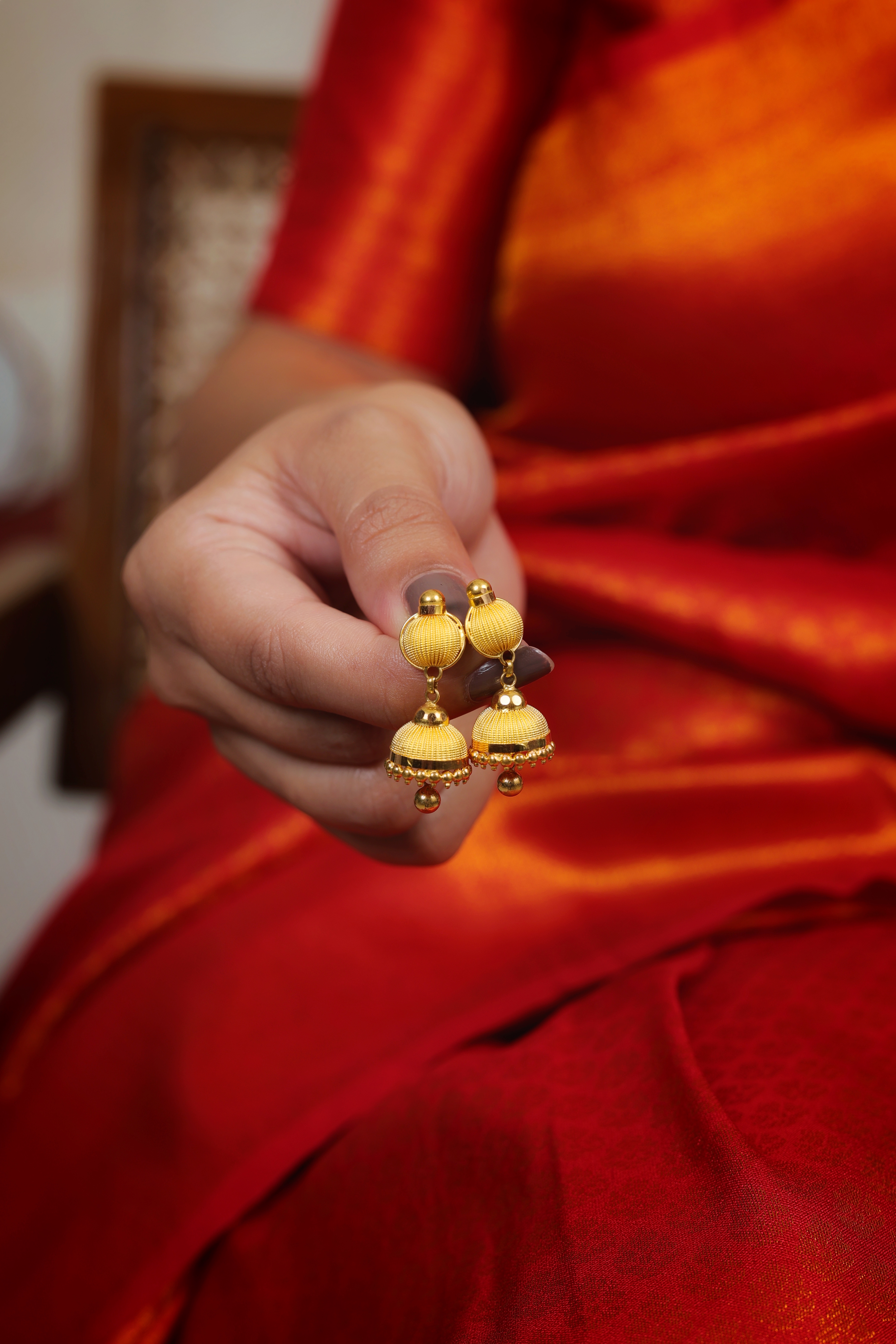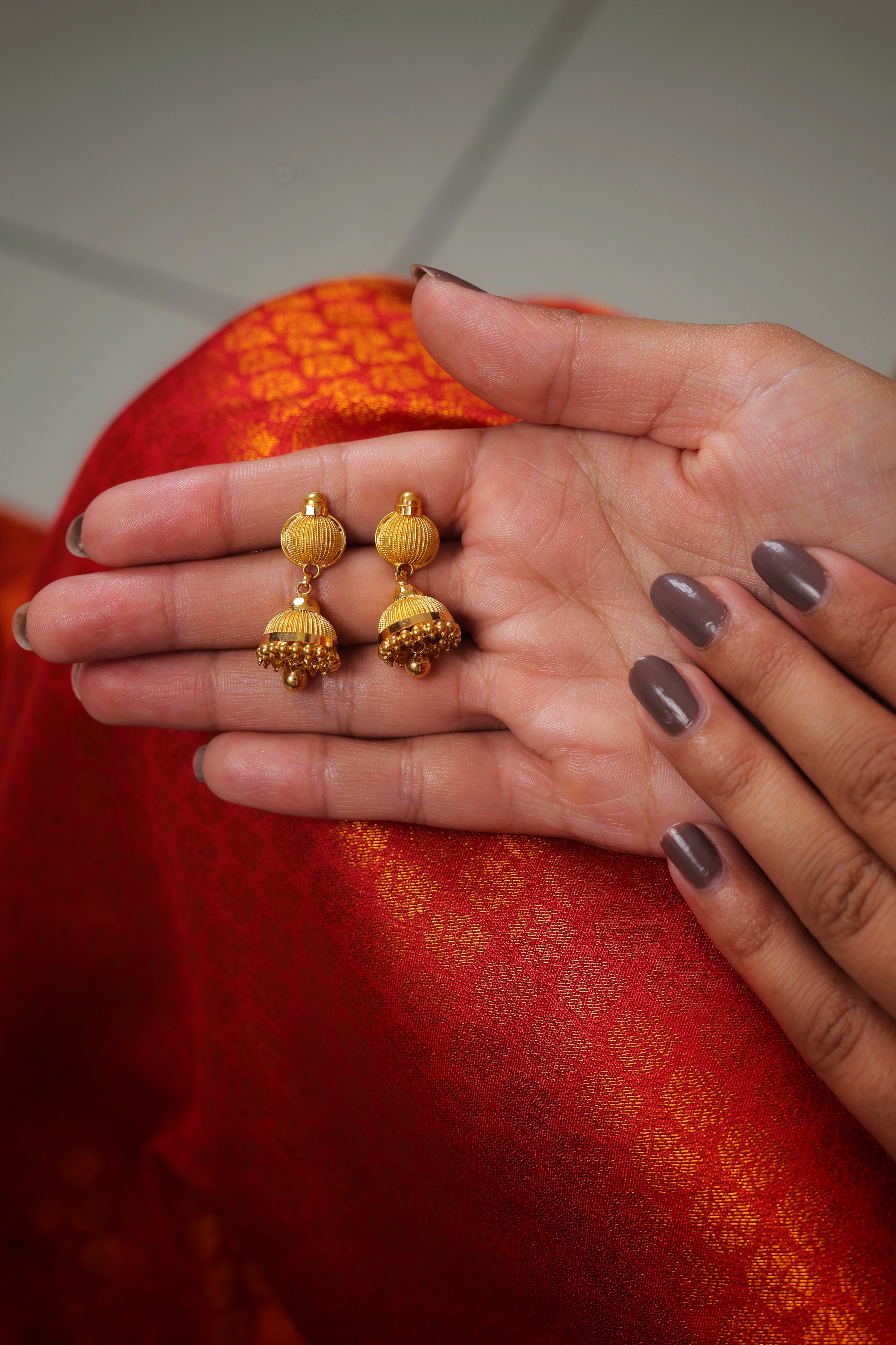 The Bell (Jhumka): The drop is a single, classic bell shape that perfectly mirrors the texture of the stud. The upper half of the bell features the same intricate vertical ribbing, while the lower edge is finished with a border of small, polished gold bead accents (ghungroos). A larger polished gold bead hangs from the center of the bell to complete the drop.