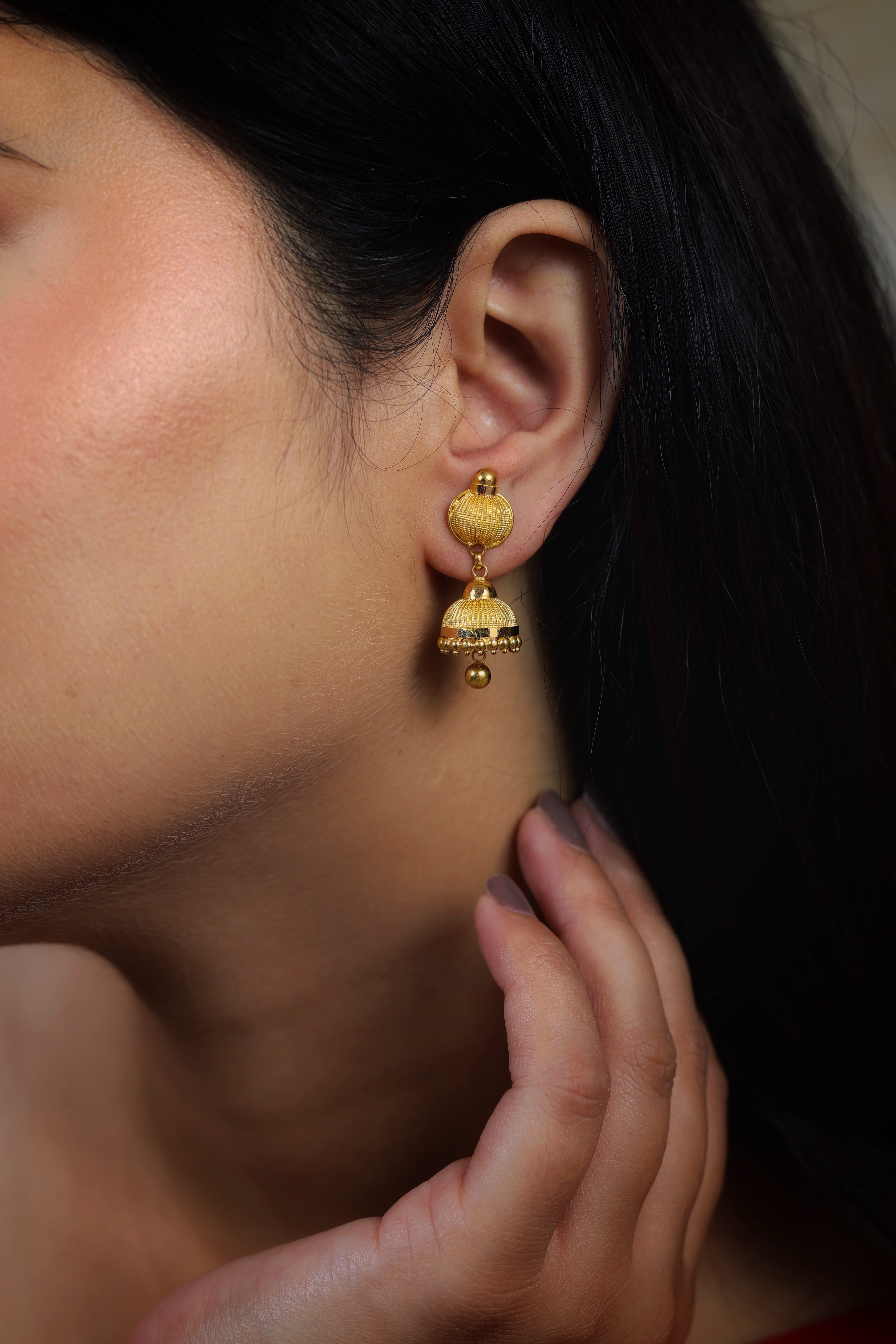 These elegant earrings offer a refined and cohesive take on the traditional Jhumki style, crafted in rich 22-carat yellow gold (916 purity). The design is characterized by a consistent, fine-lined texture that catches the light beautifully from every angle.