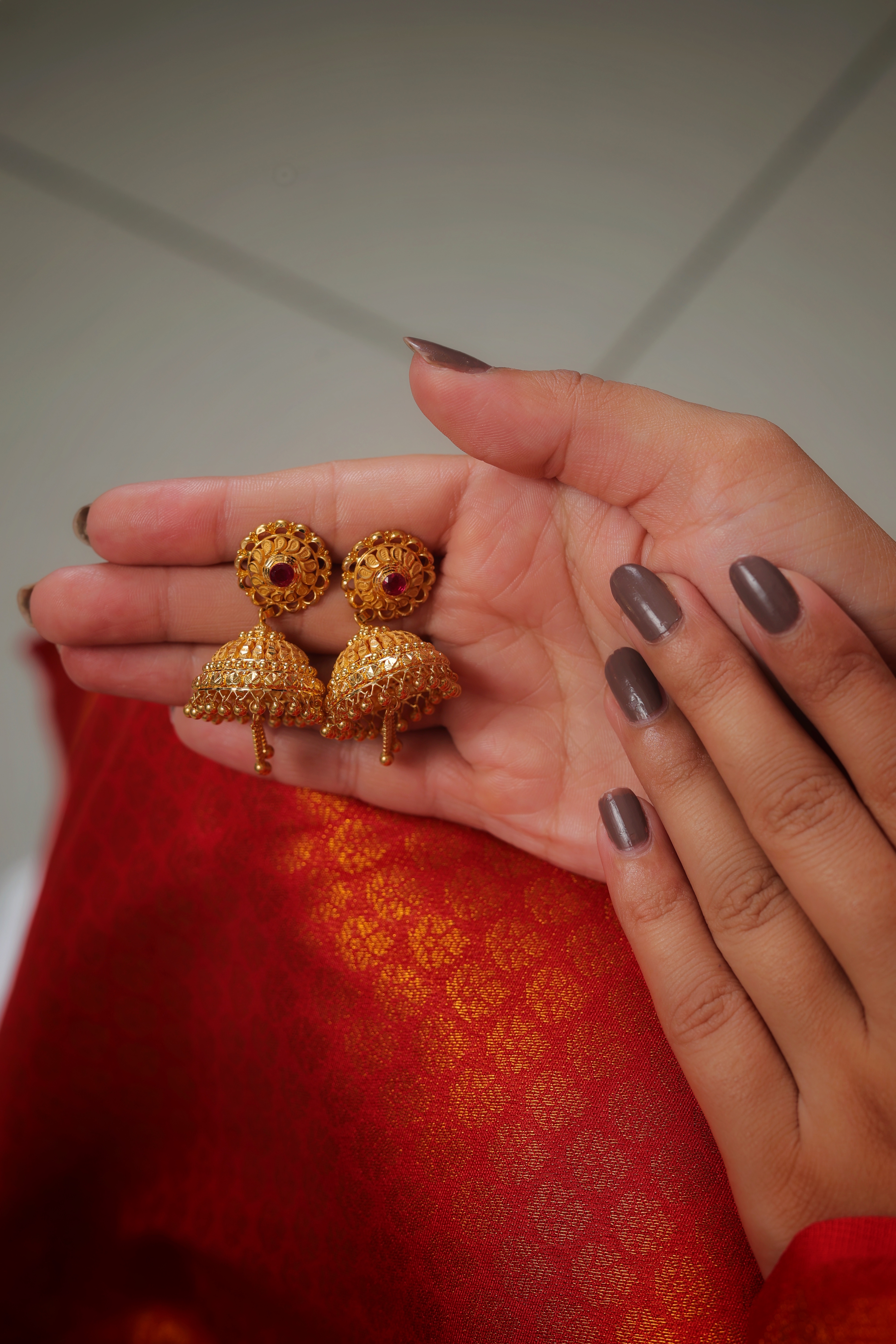 Key Features:Design: Statement Jhumki style with a vibrant ruby-studded floral top. Motif: Detailed medallion stud and a large, textured bell drop. Accents: Features pinkish-red rubies and dangling gold bead borders. Metal Purity: 22 Carat Yellow Gold (916 purity). Usage: A premium choice for weddings, bridal jewelry, and grand traditional celebrations.