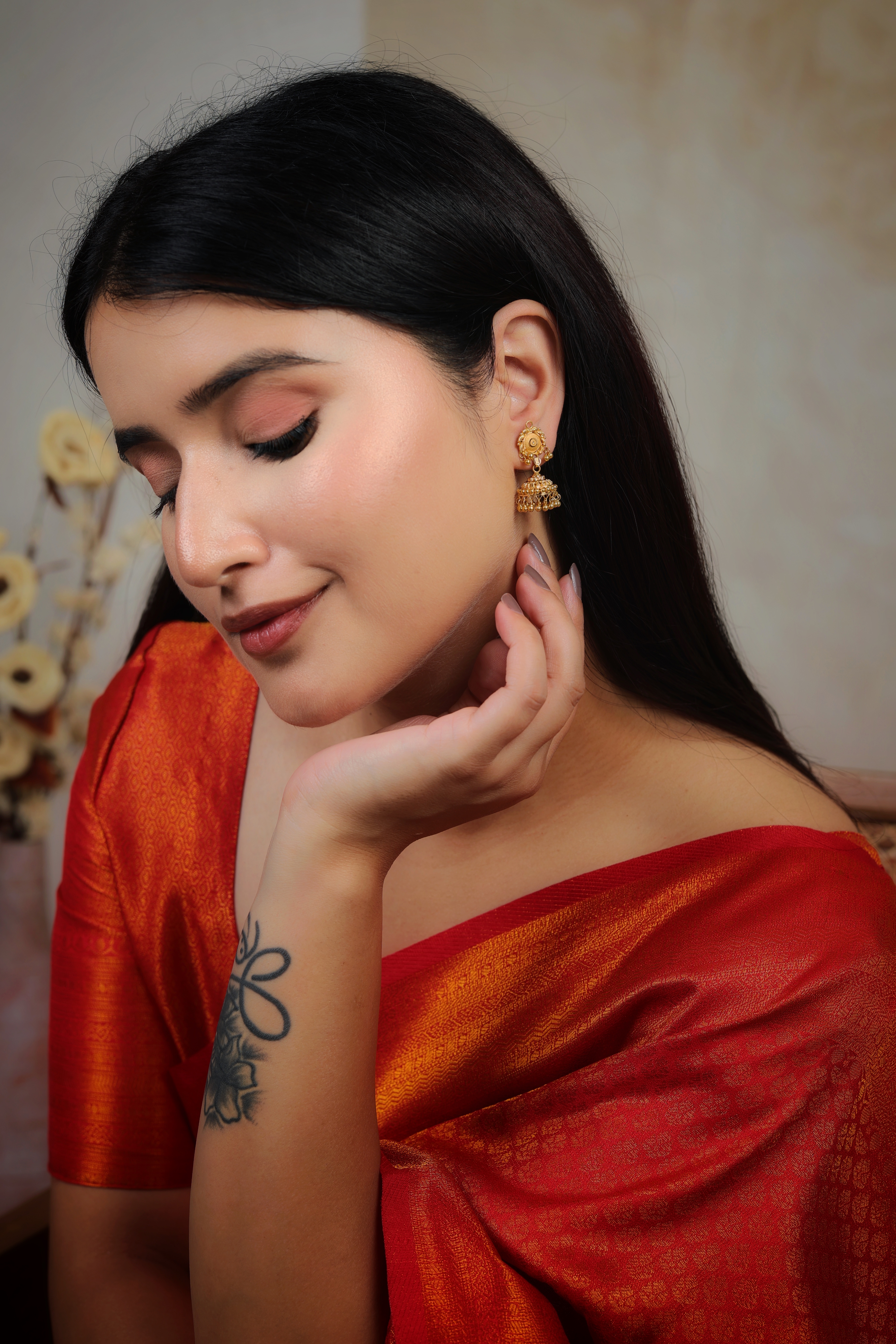 The Bell (Jhumka): The drop is a single, classic inverted bell. The surface of the bell is beautifully finished with vertical ribbing and a fine mesh-like texture, creating a rich, matte-gold shimmer. The bottom edge is finished with a neat row of dangling gold beads (ghungroos) that provide subtle movement and sparkle.