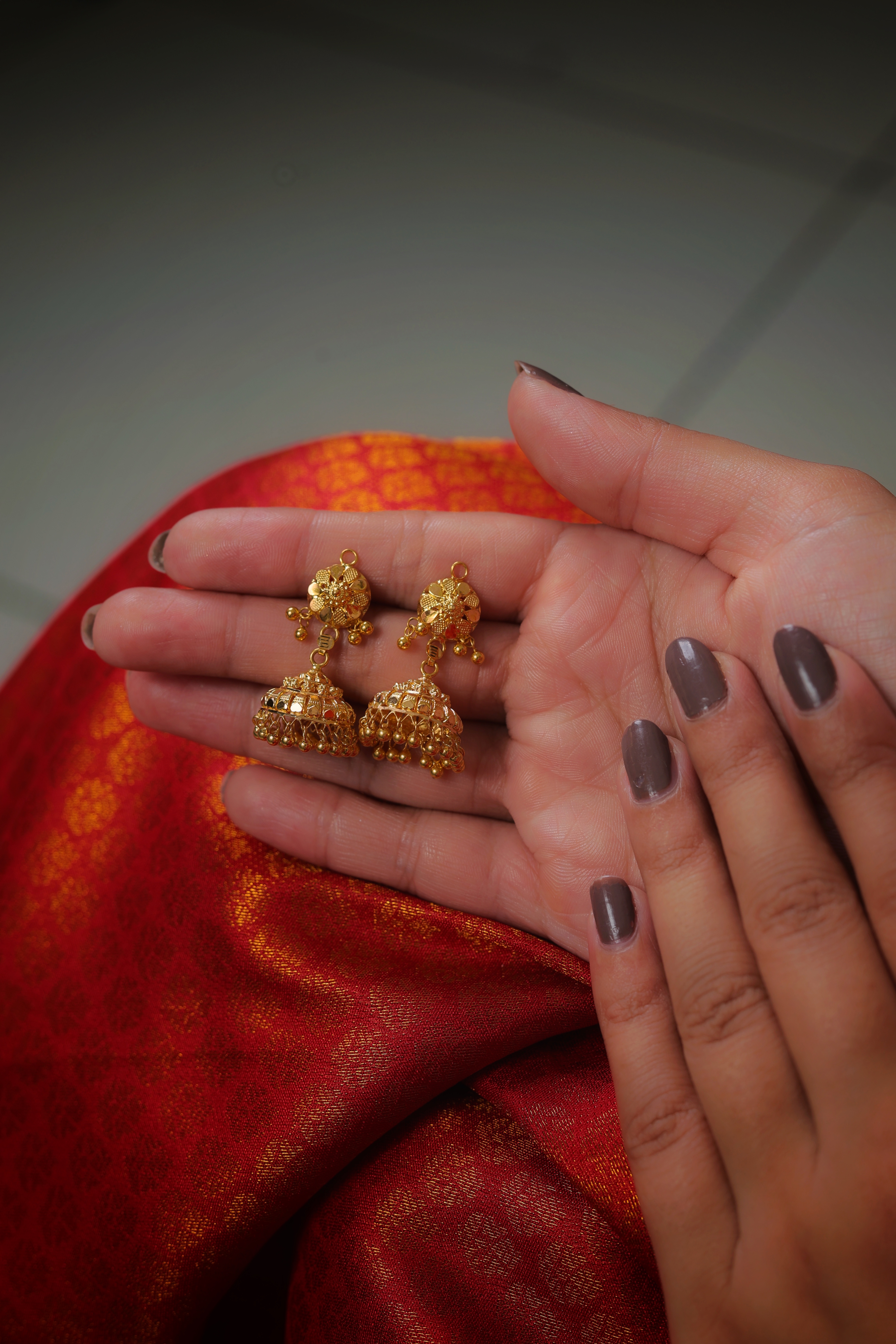 The Bell (Jhumka): The main drop is a perfectly proportioned inverted bell. The upper half is textured with vertical ribbing, while the lower half features a stunning heart-shaped filigree border. This lace-like goldwork creates a light, airy aesthetic.