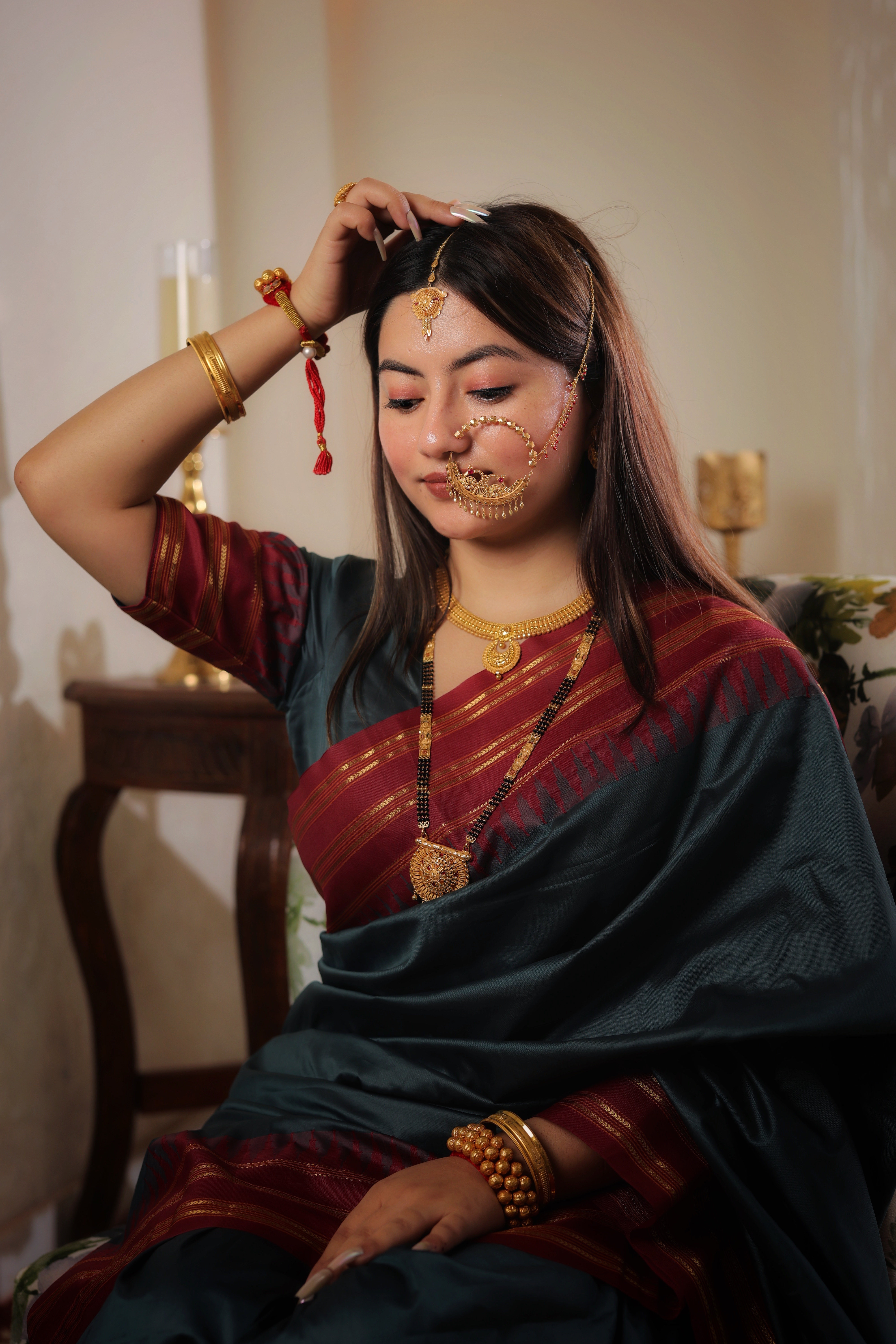 A sophisticated traditional headpiece featuring a circular shield-style medallion with layered goldwork, subtle enamel highlights, and a structured gold tassel drop.