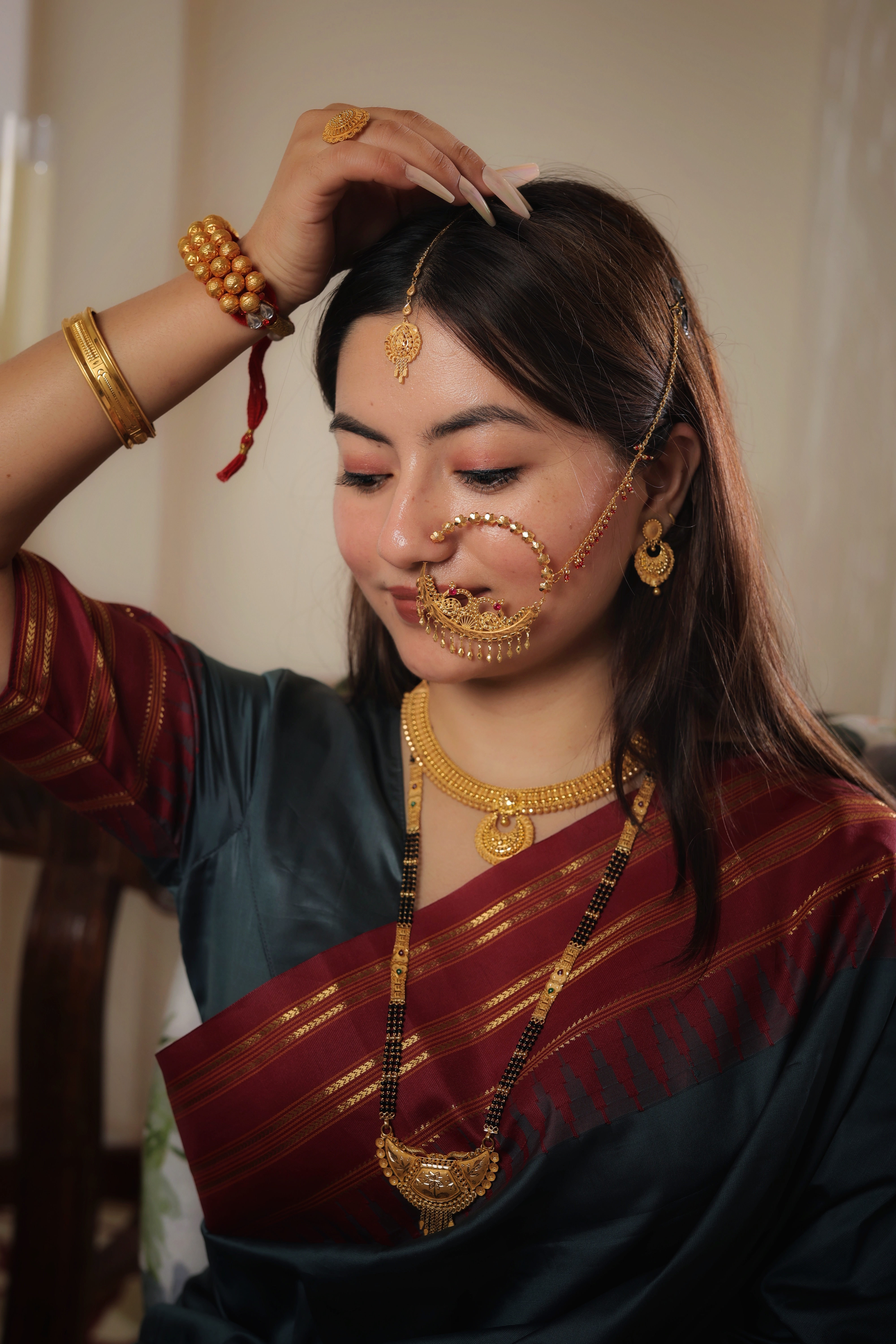Key Features:Design: Traditional Circular Medallion with a focus on fine openwork filigree. Accents: Features a unique triple-column tassel drop and an ornate leaf-link chain. Texture: Expertly crafted with fine wirework and high-relief gold accents. Metal Purity: 22 Carat Yellow Gold (916 purity). Usage: A perfect statement accessory for brides, bridesmaids, and festive traditional celebrations.