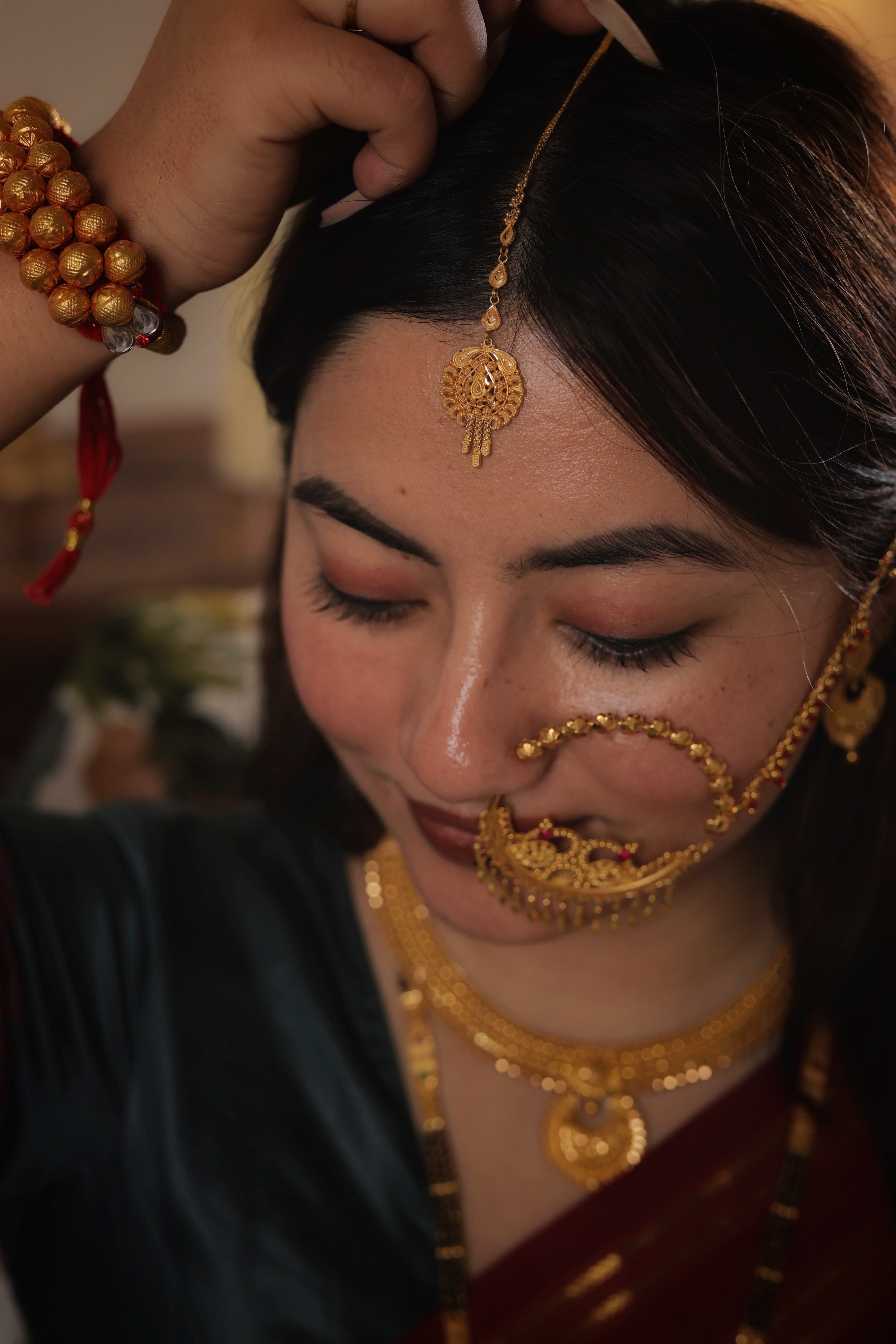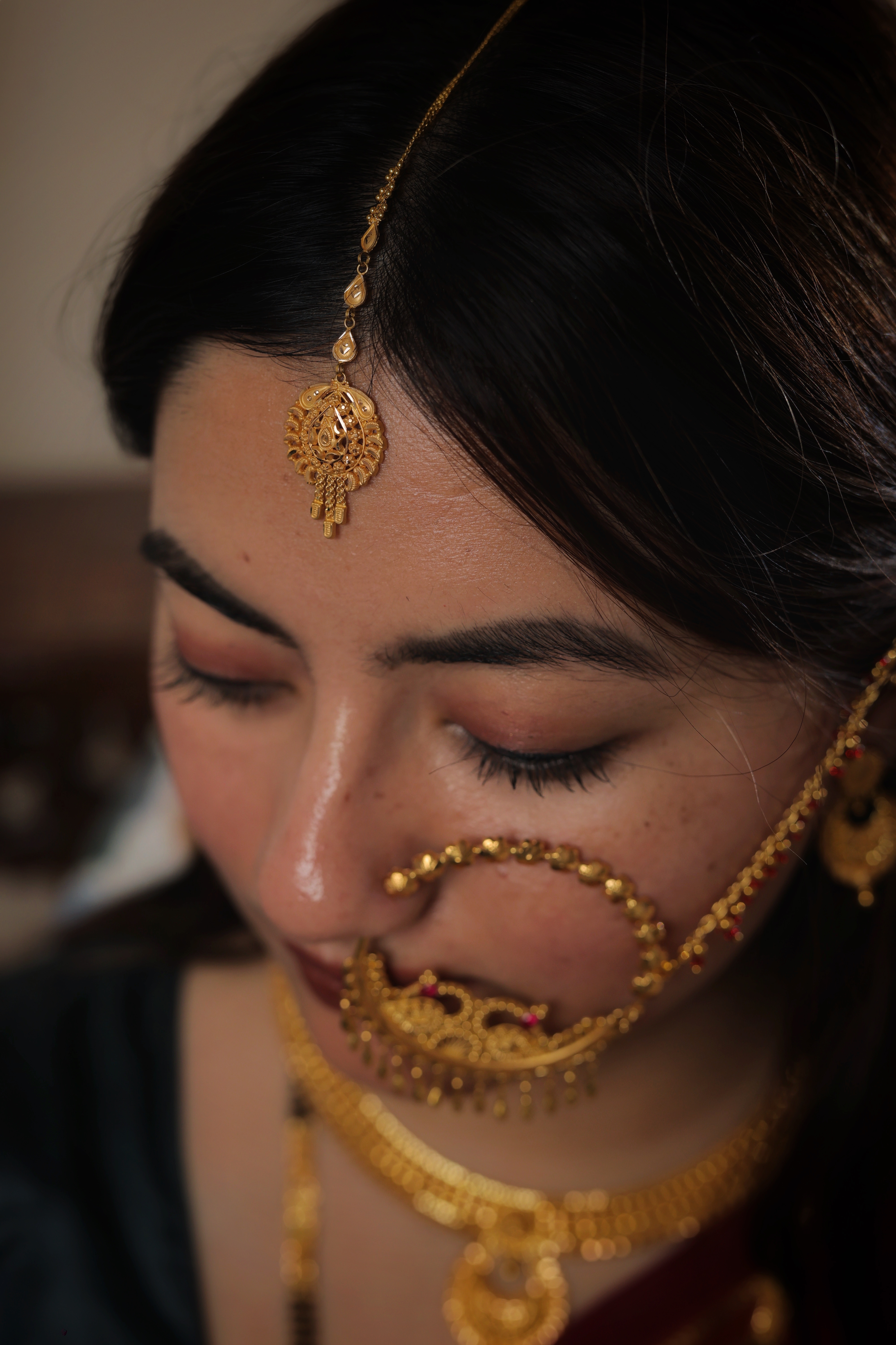 This elegant Maang Tika is a beautiful example of fine traditional craftsmanship, meticulously rendered in rich 22-carat yellow gold (916 purity). The design emphasizes delicate symmetry and airy textures, creating a regal look that is both ornate and graceful.