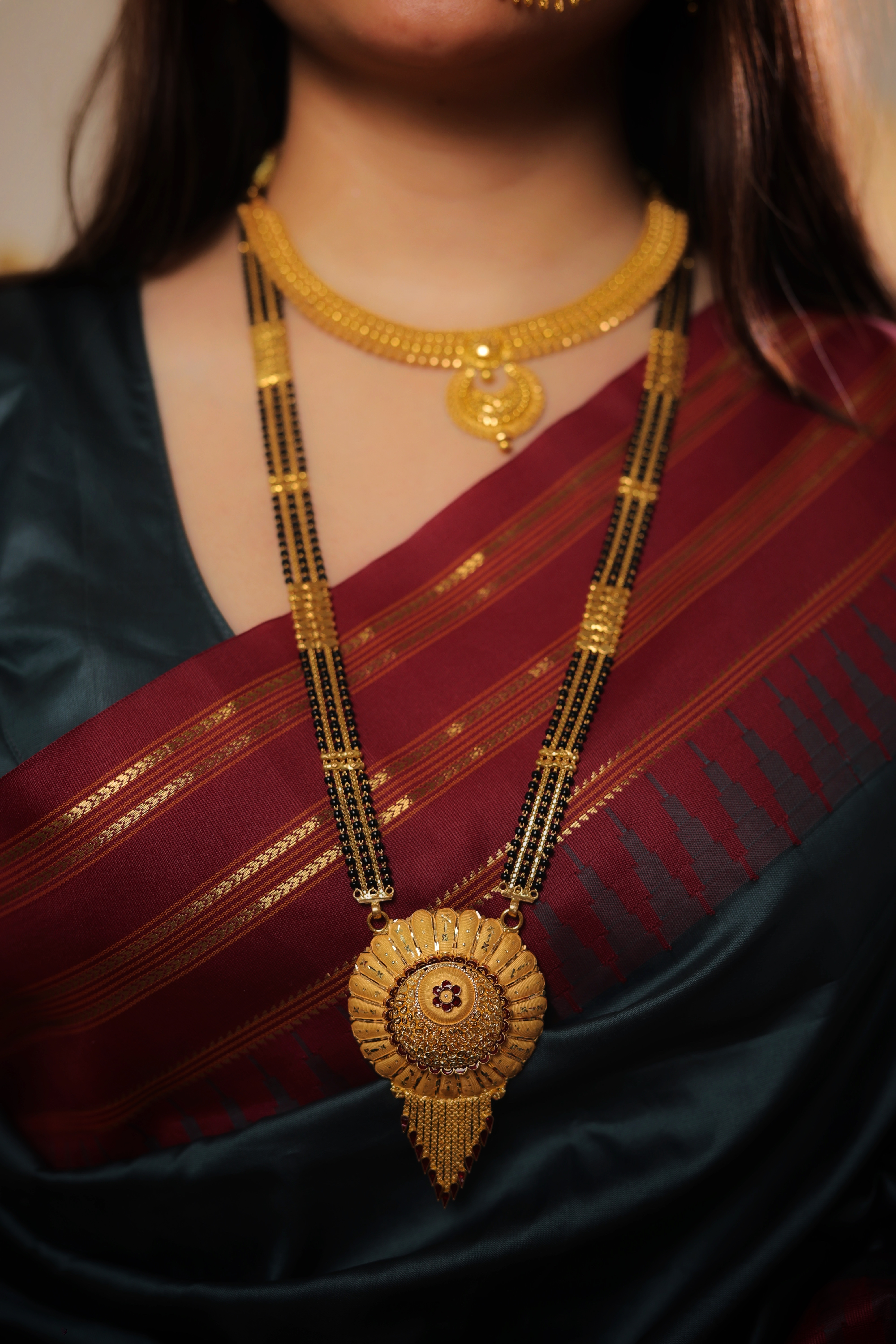 This stunning Long Mangalsutra is a masterpiece of traditional Indian heritage, expertly crafted in 22-carat yellow gold (916 purity). The piece is designed to be a centerpiece of bridal and festive attire, combining spiritual significance with high-artistry goldwork.
