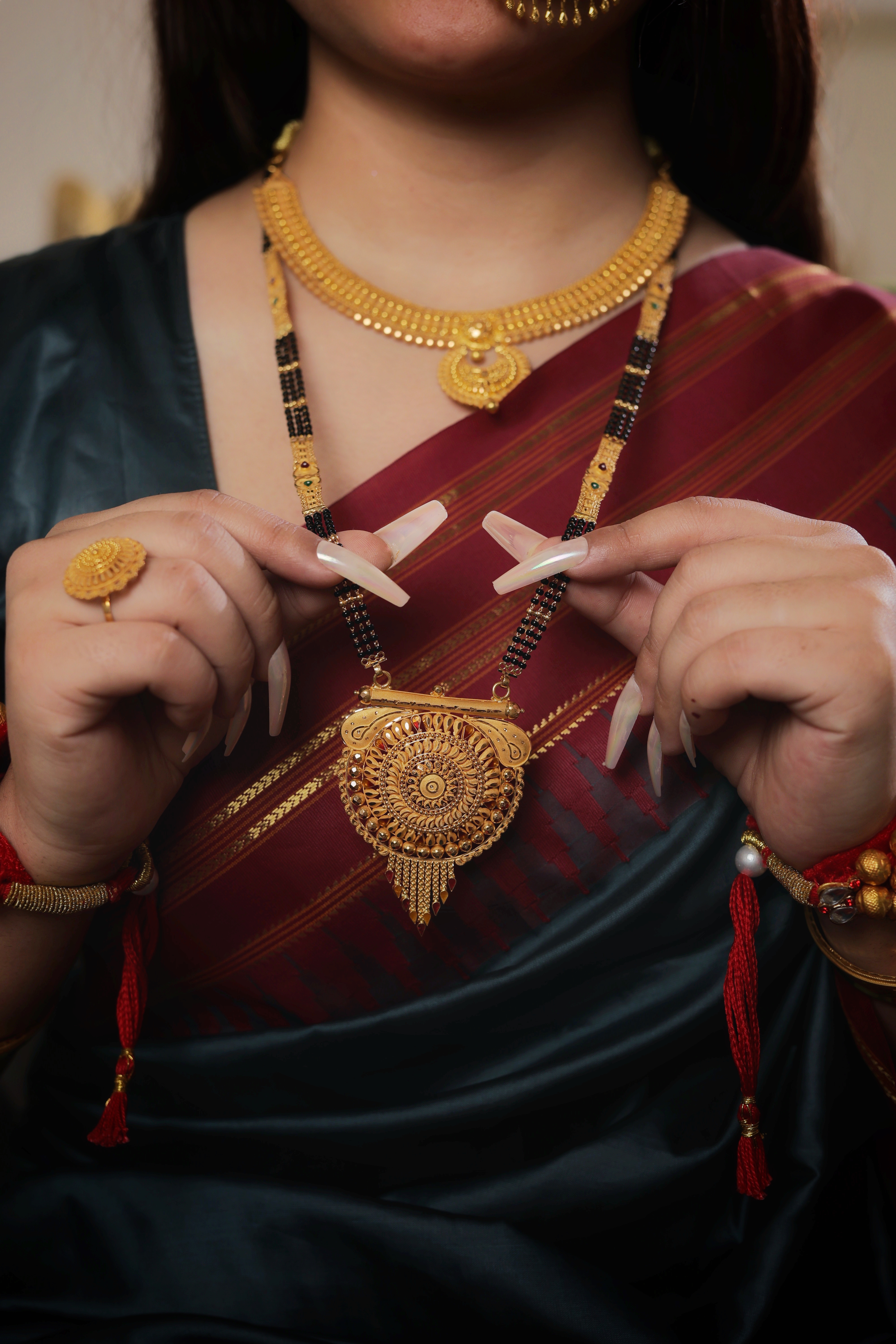 The Chain: The pendant is anchored by four strands of traditional black beads, signifying protection and the sacred bond of marriage. The chain is uniquely embellished with elongated gold spacers featuring enameled accents in red and green, alongside granulated gold beads that lead to a stately traditional length.