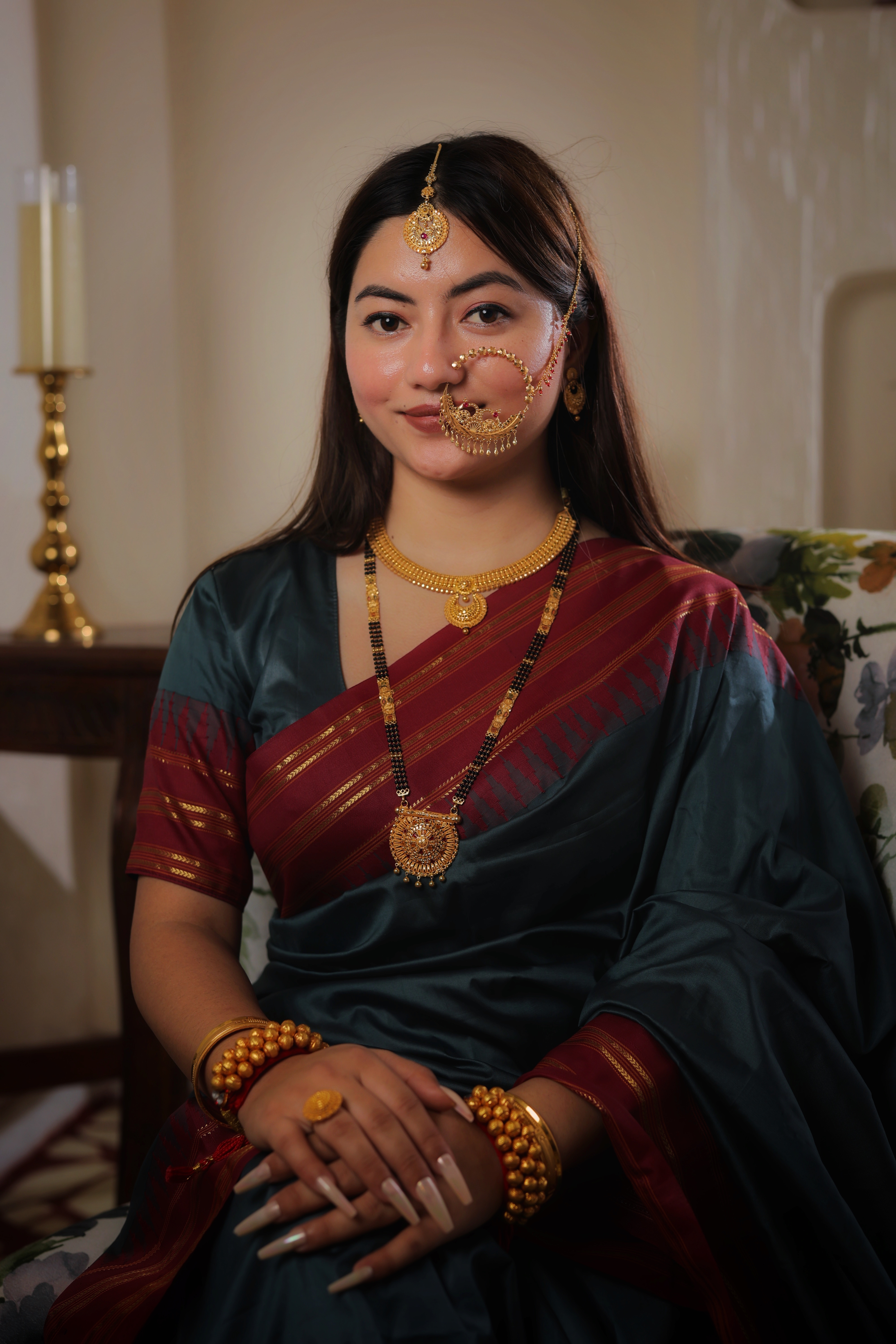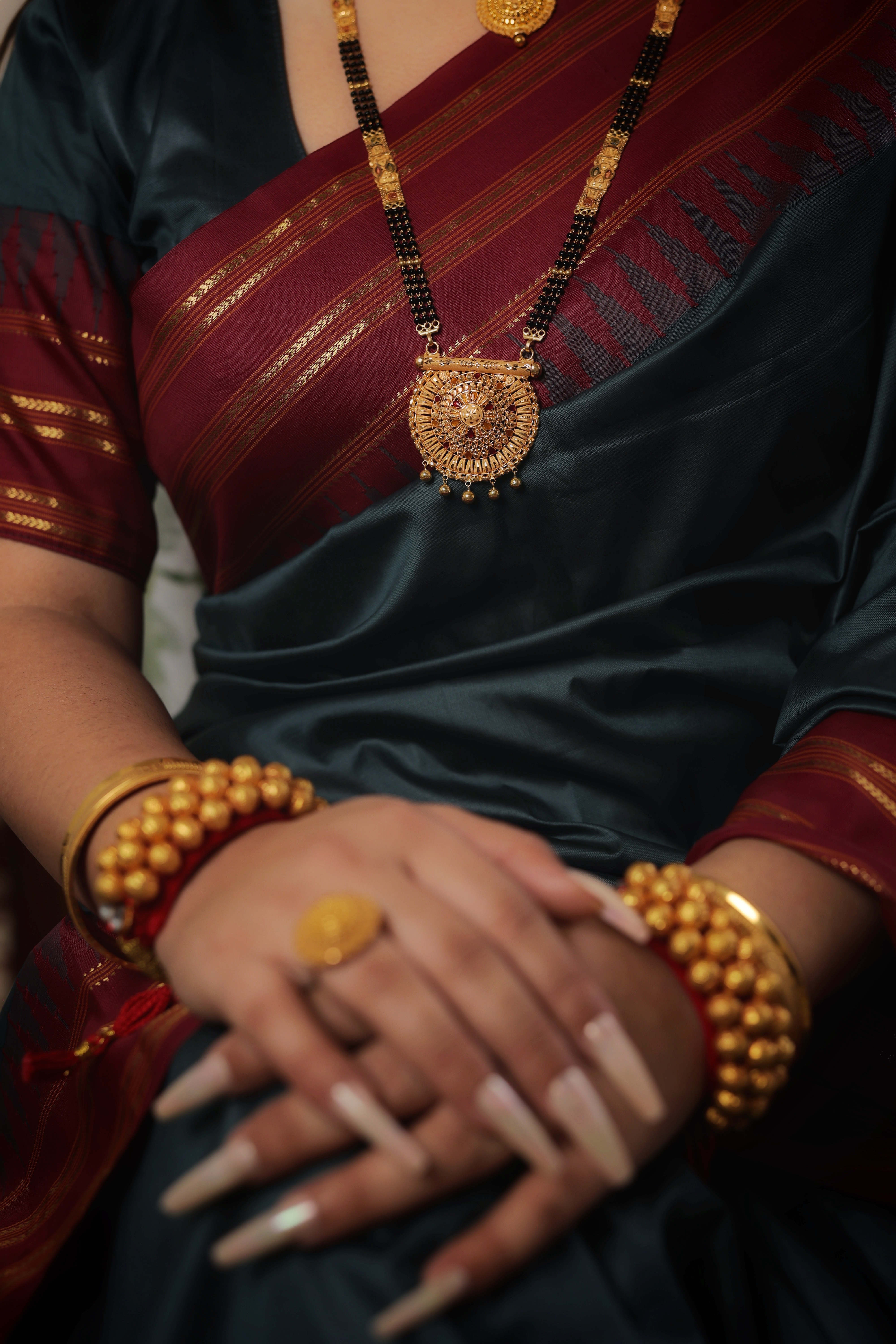The Chain: The pendant is anchored by dual strands of traditional black beads, signifying protection and the sacred bond of marriage. The chain is uniquely embellished with ornate gold spacers featuring enameled floral accents in red and green, leading to a stately traditional length.