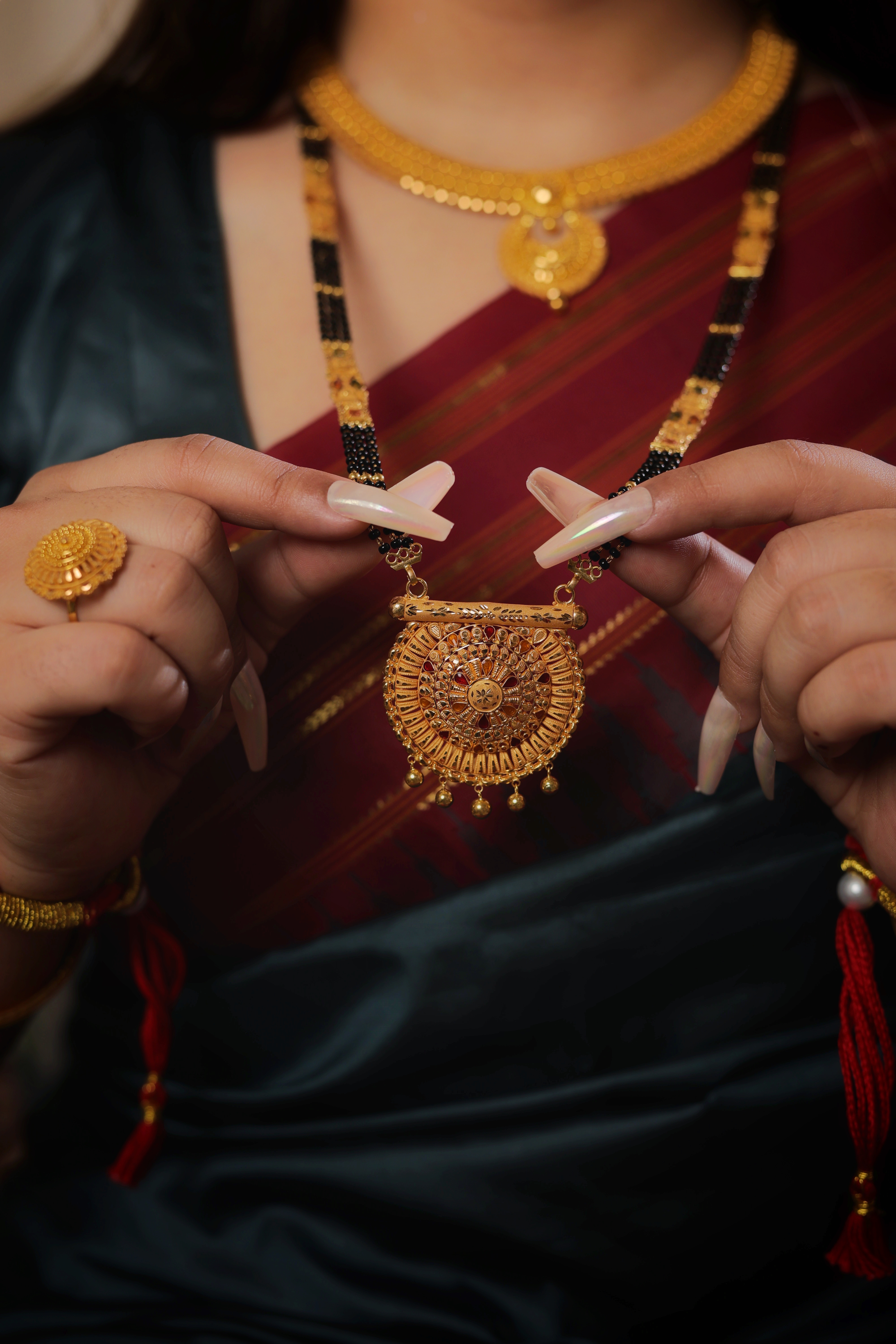 Key Features:Design: Majestic Circular Sunburst Pendant with intricate multi-textured filigree. Chain Style: Traditional dual-strand black bead configuration with enameled gold spacers. Detailing: Features a series of dangling gold beads for a rhythmic and sophisticated finish. Metal Purity: 22 Carat Yellow Gold (916 purity). Usage: A magnificent statement piece for weddings, grand festivals, and significant family milestones.