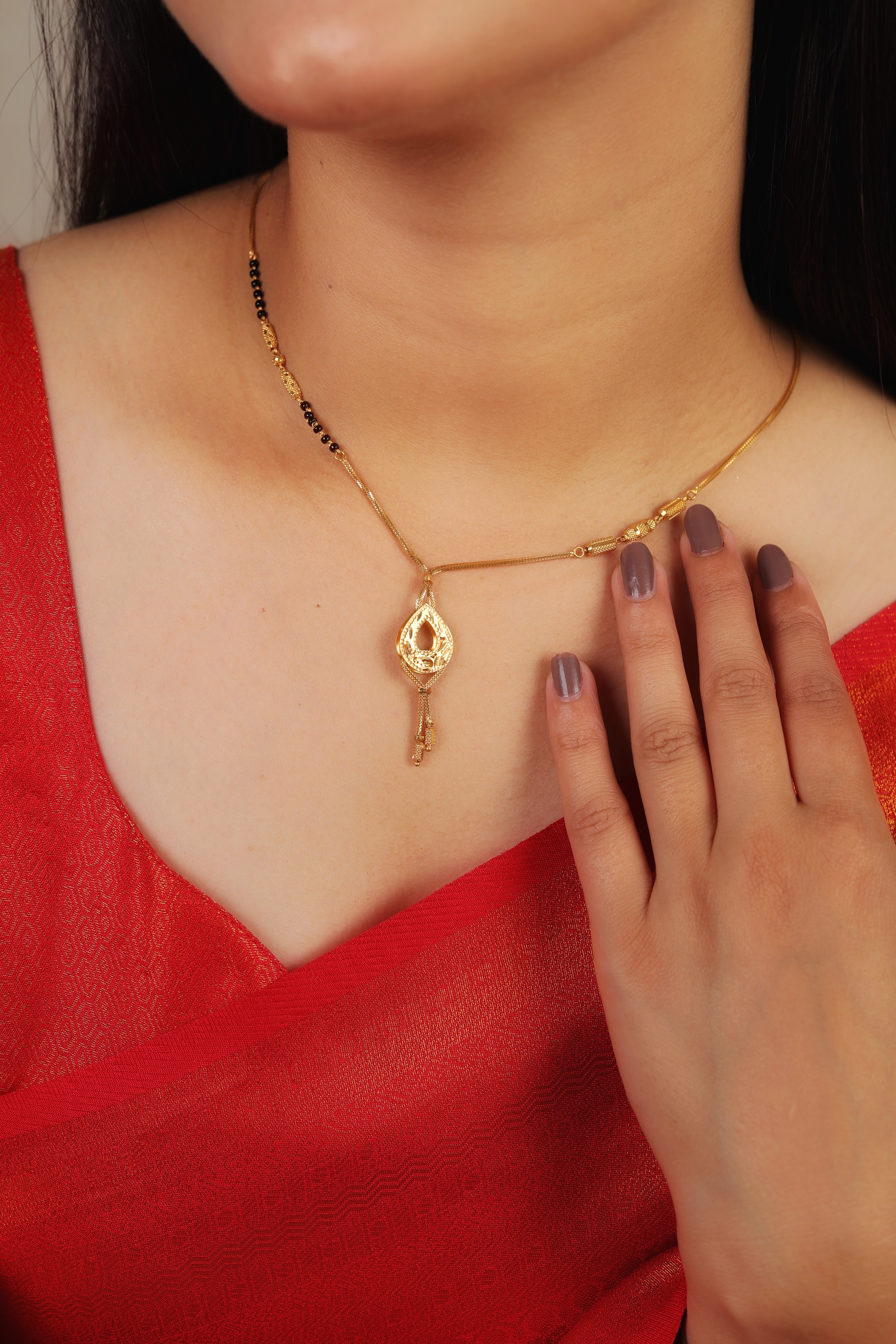 Key Features:Design: Creative Teardrop Key Pendant with open-work filigree and a vertical drop. Chain Style: Modern slender gold link chain featuring asymmetrical textured gold and black bead clusters. Length: Designed as a short-length mangalsutra, resting elegantly at the collarbone. Metal Purity: 22 Carat Yellow Gold (916 purity). Usage: An ideal statement accessory for the modern workplace, casual signature jewelry, or contemporary bridal gifting.