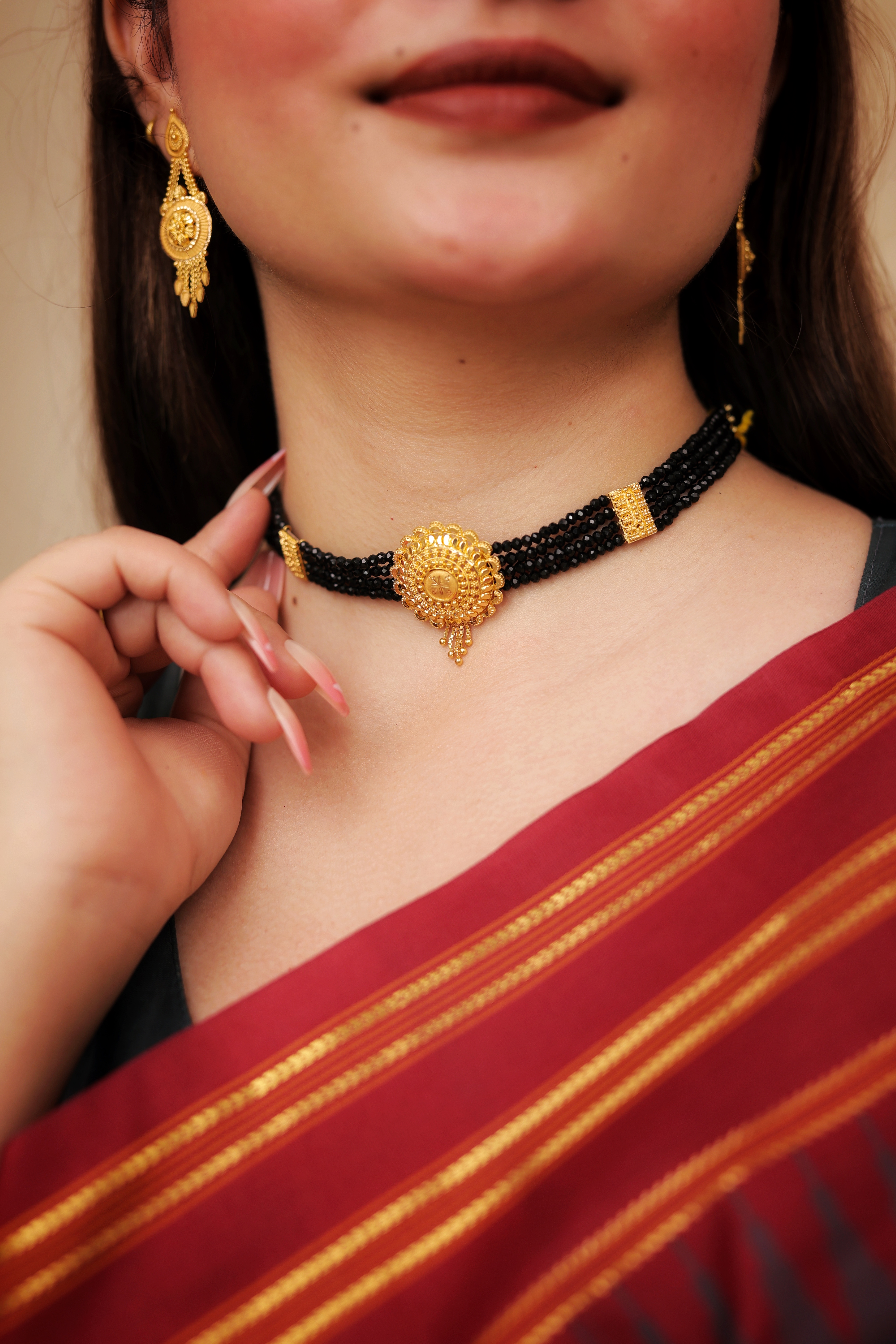 A classic multi-strand black beaded Chokhar featuring a beautifully handcrafted 22K gold round centerpiece, perfect for daily wear, festive wear, and bridal jewellery collections.