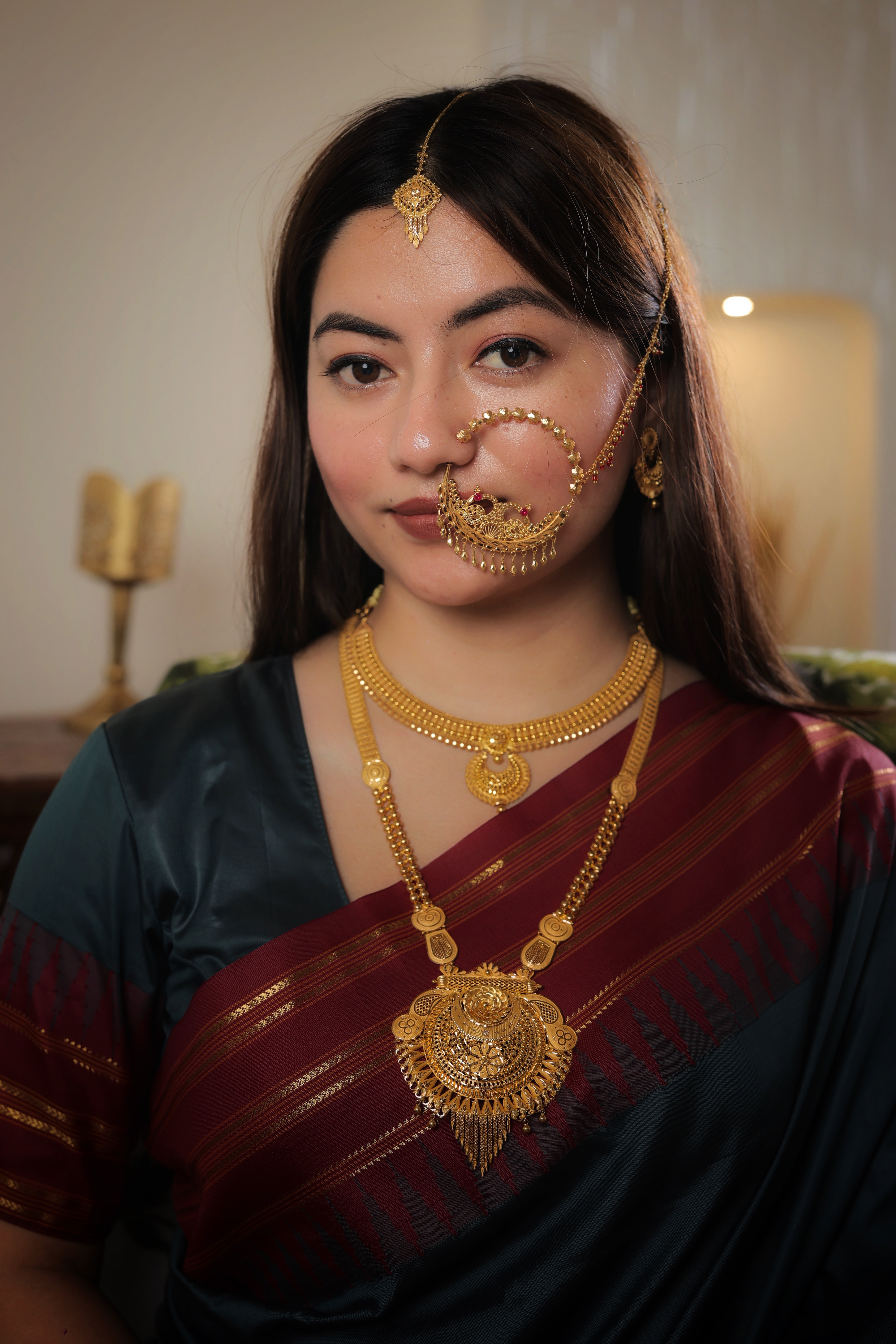 The design emphasizes architectural opulence and rhythmic gold-work:The Medallion: The focal point is a massive, circular pendant featuring concentric rings of high-definition filigree, a central floral boss, and granular textures. The Tassels: Suspending from the base of the medallion is a graduated tiered tassel composed of fine gold chains and micro-etched droplets, providing fluid movement and grand scale. The Side Panels: The pendant is supported by two architectural side connectors that transition the design seamlessly into the main chains. The Chain: The necklace features dual strands of thick, textured gold chains that are punctuated by floral-etched spacers, ensuring the piece maintains a luxurious presence along its entire length. Artisanal Finish: The combination of polished gold accents and deep-etched matte filigree creates a layered, light-catching effect suitable for the grandest occasions.
