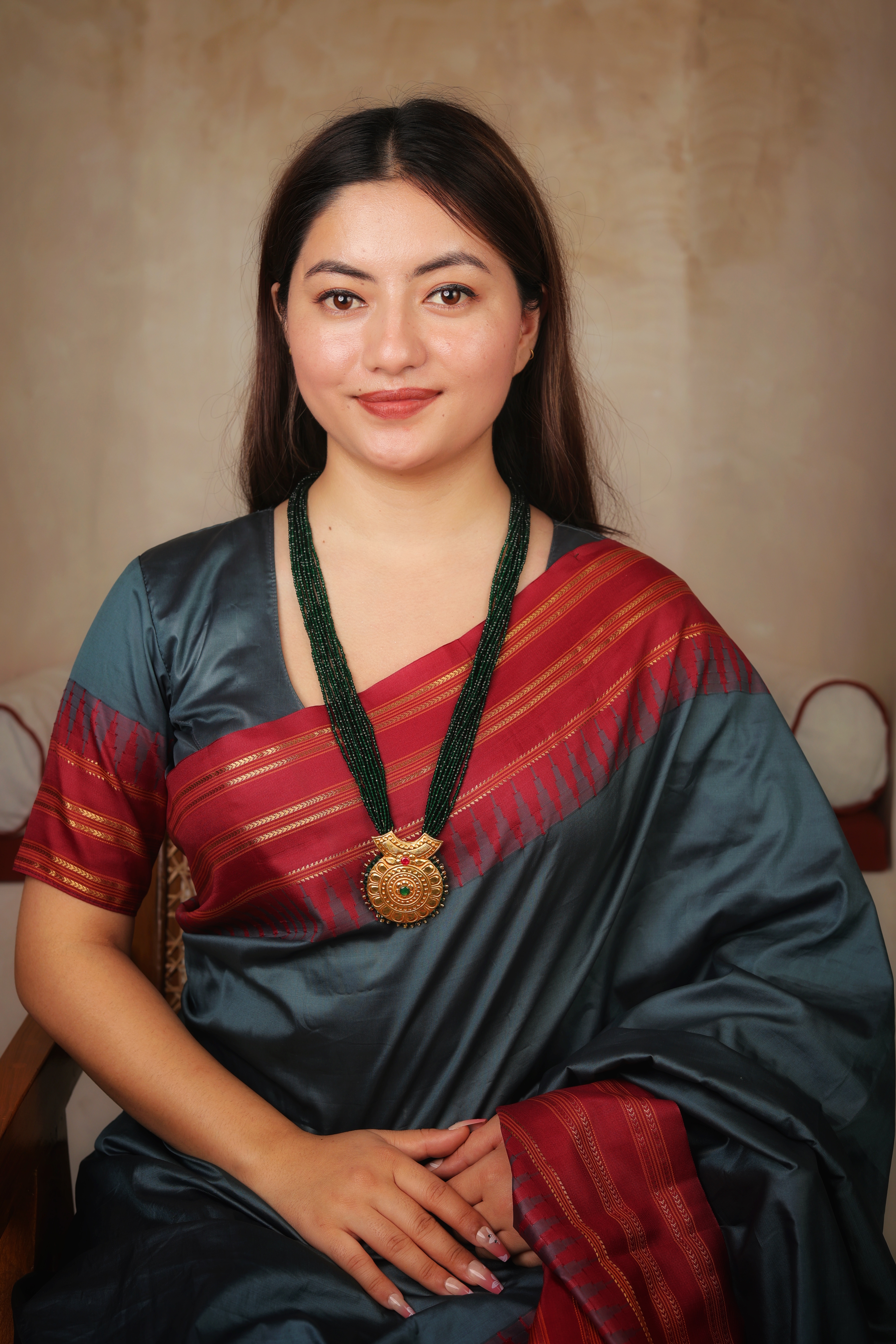 Crafted in pure 24K gold with an authentic antique finish Circular pendant with intricate concentric traditional carvings Highlighted with central green stone and red accent detailing Multi-strand green bead necklace for a regal, traditional look Inspired by temple and heritage antique jewellery designs Ideal for bridal wear, festive occasions, and cultural celebrations