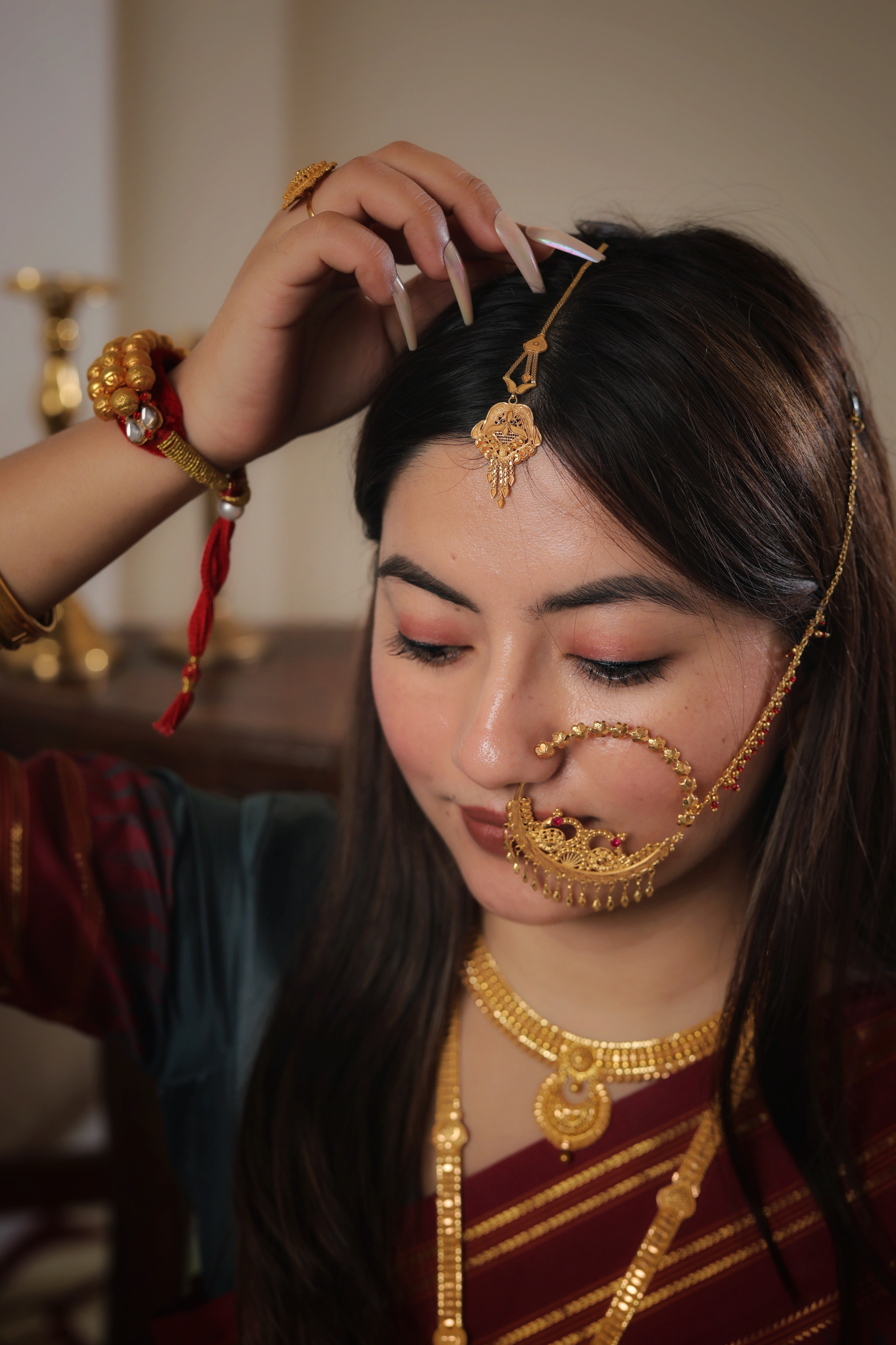 This 22K Gold Maang Tikka is a timeless piece inspired by traditional Indian jewellery craftsmanship. Designed with delicate filigree work and graceful hanging elements, it beautifully enhances the forehead and completes a bridal or festive ensemble. The refined antique finish adds depth and character, making it a perfect choice for weddings, rituals, and cultural celebrations.