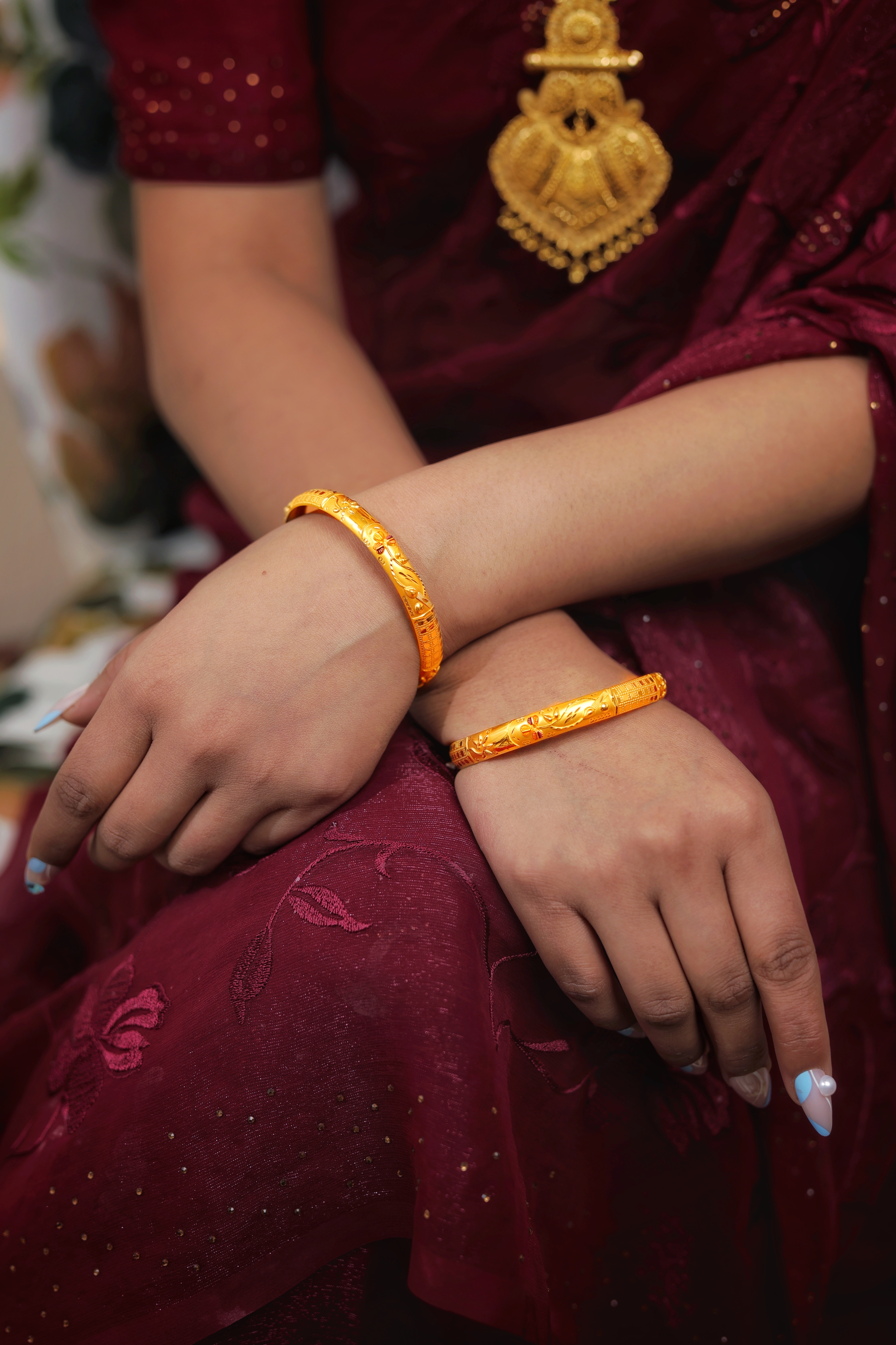Design: Traditional engraved gold bangle design Finish: High-polish rich gold tone finish Pattern: Floral and traditional engraved detailing Style: Traditional, festive, daily wear jewellery Comfort: Lightweight with smooth inner surface Occasion: Weddings, festivals, daily wear, gifting