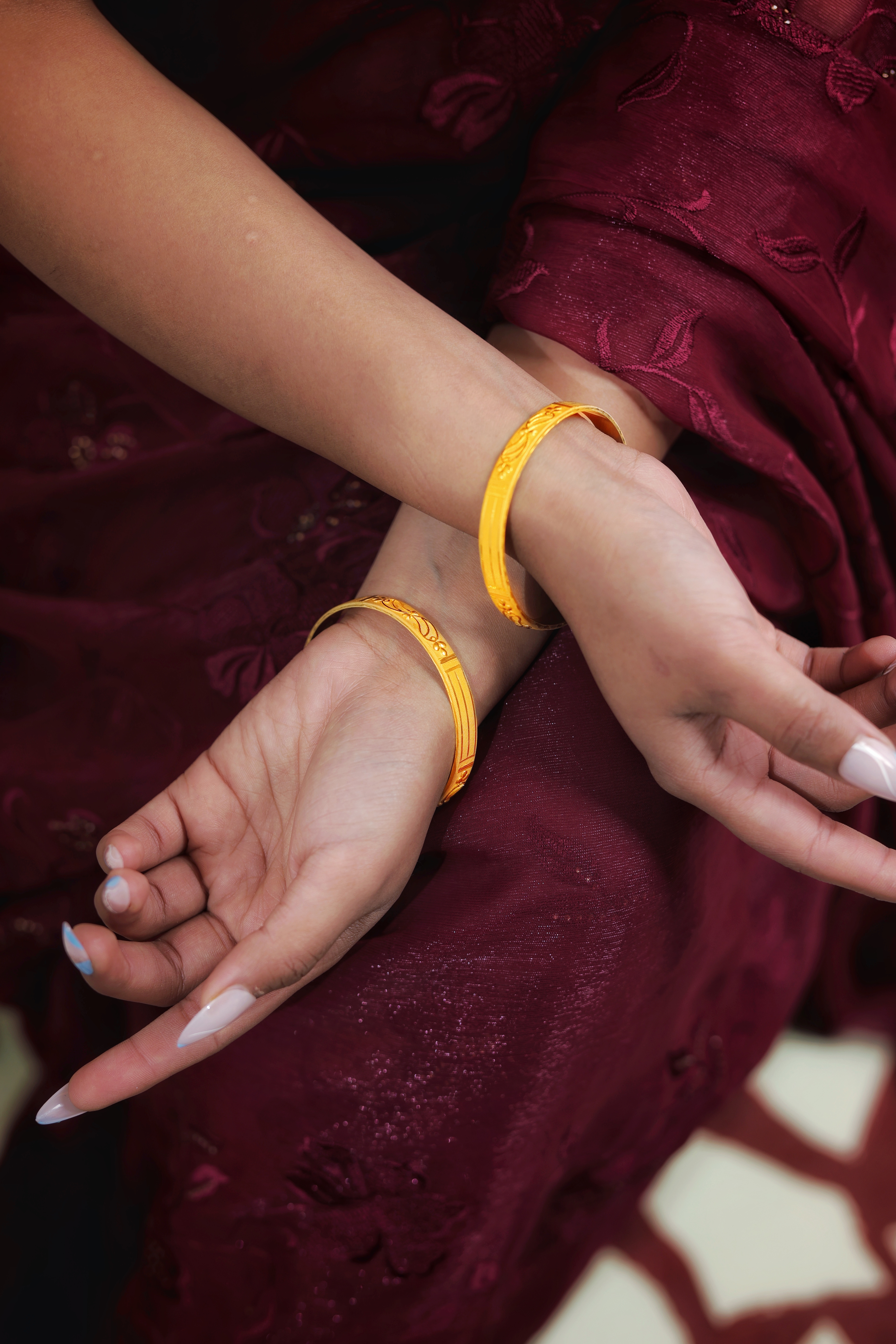 Add timeless beauty to your jewellery collection with these beautifully crafted traditional floral engraved gold bangles, designed to reflect classic elegance and detailed craftsmanship.
