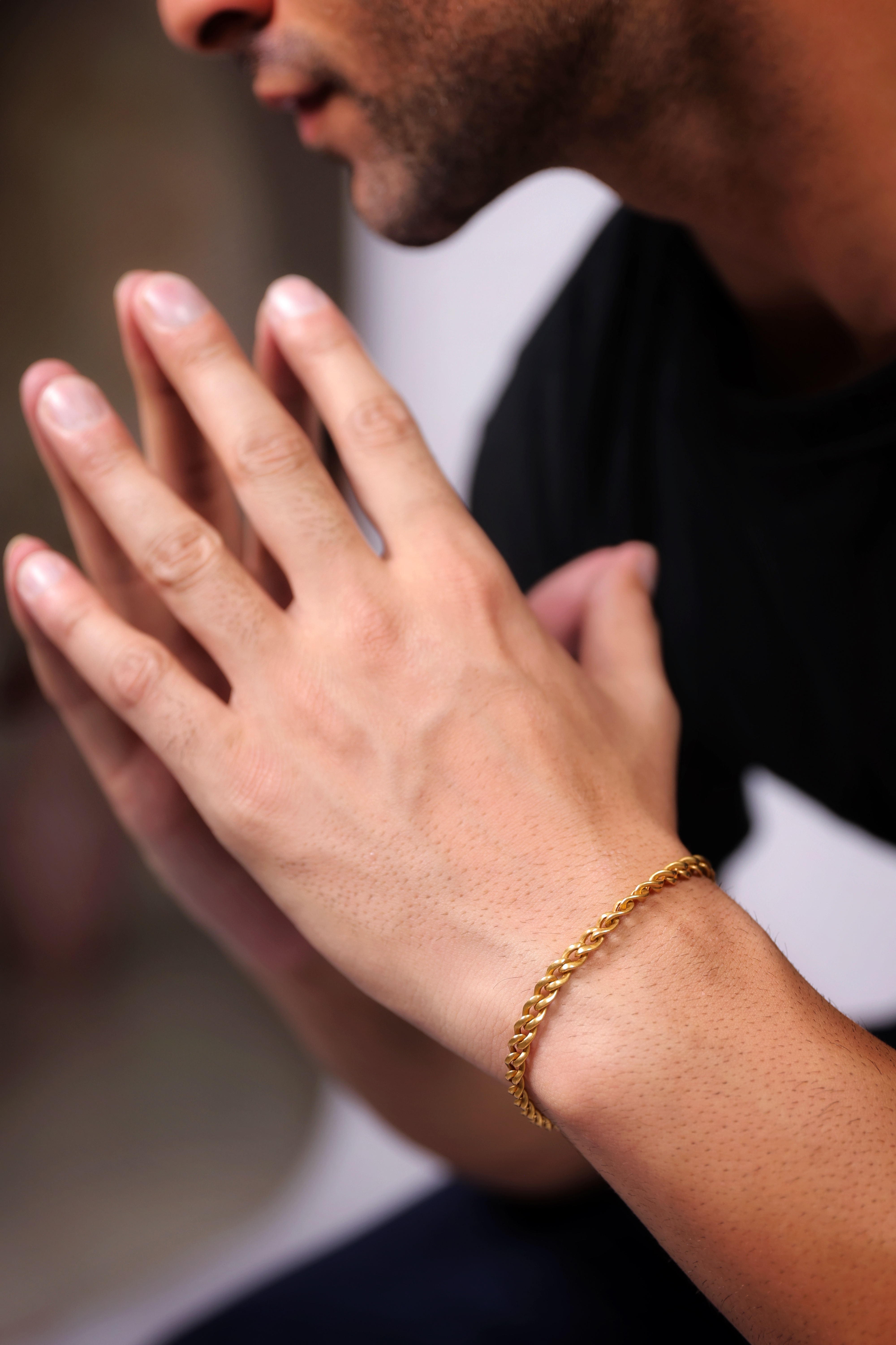 This 22K gold men’s bracelet features a refined rope-chain design that blends subtle elegance with everyday versatility. Crafted with smooth, rounded links that sit comfortably on the wrist, it offers a warm, natural shine that complements both casual denim looks and polished outfits. The bracelet feels lightweight yet durable, making it ideal for daily wear while still carrying the sophistication of fine gold craftsmanship. Its timeless style adds a touch of confidence and understated luxury to any man’s wardrobe, making it a perfect choice for those who appreciate minimal, classic jewellery with lasting appeal.