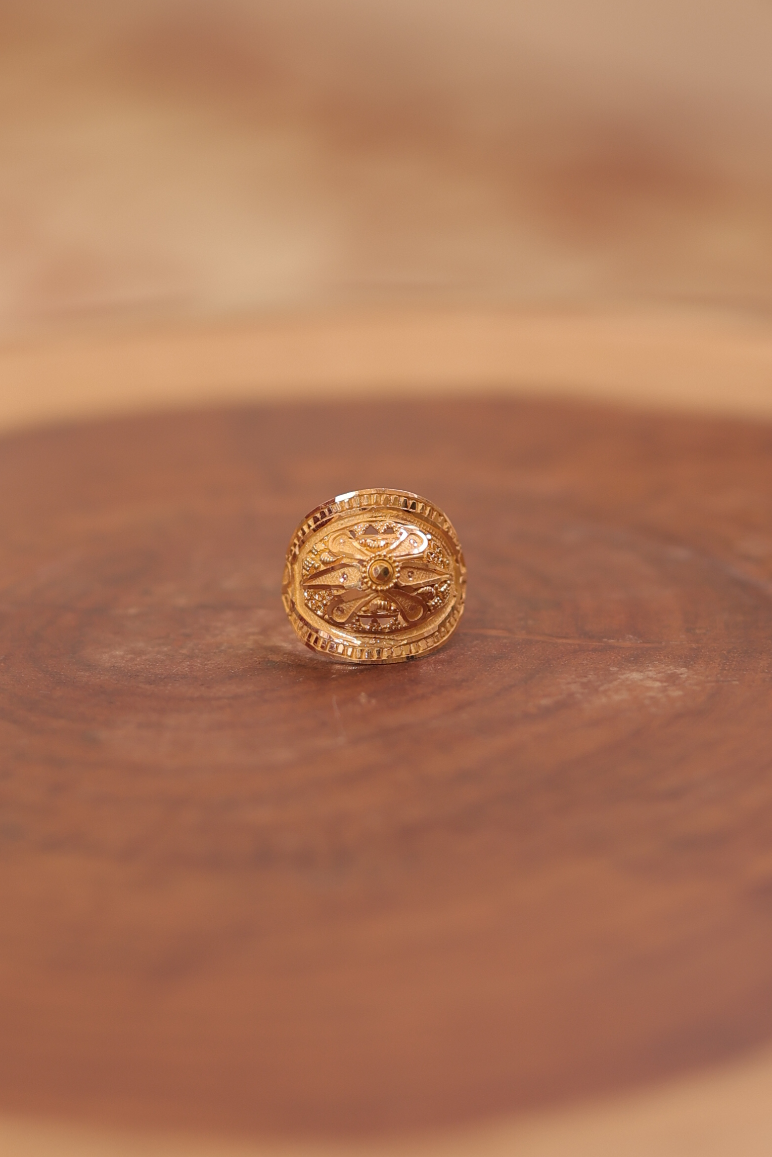 A radiant, traditional 22-carat yellow gold oval ring featuring highly detailed openwork filigree and granulation. Perfect as a statement or cocktail piece, this ring embodies exquisite handcrafted artistry.