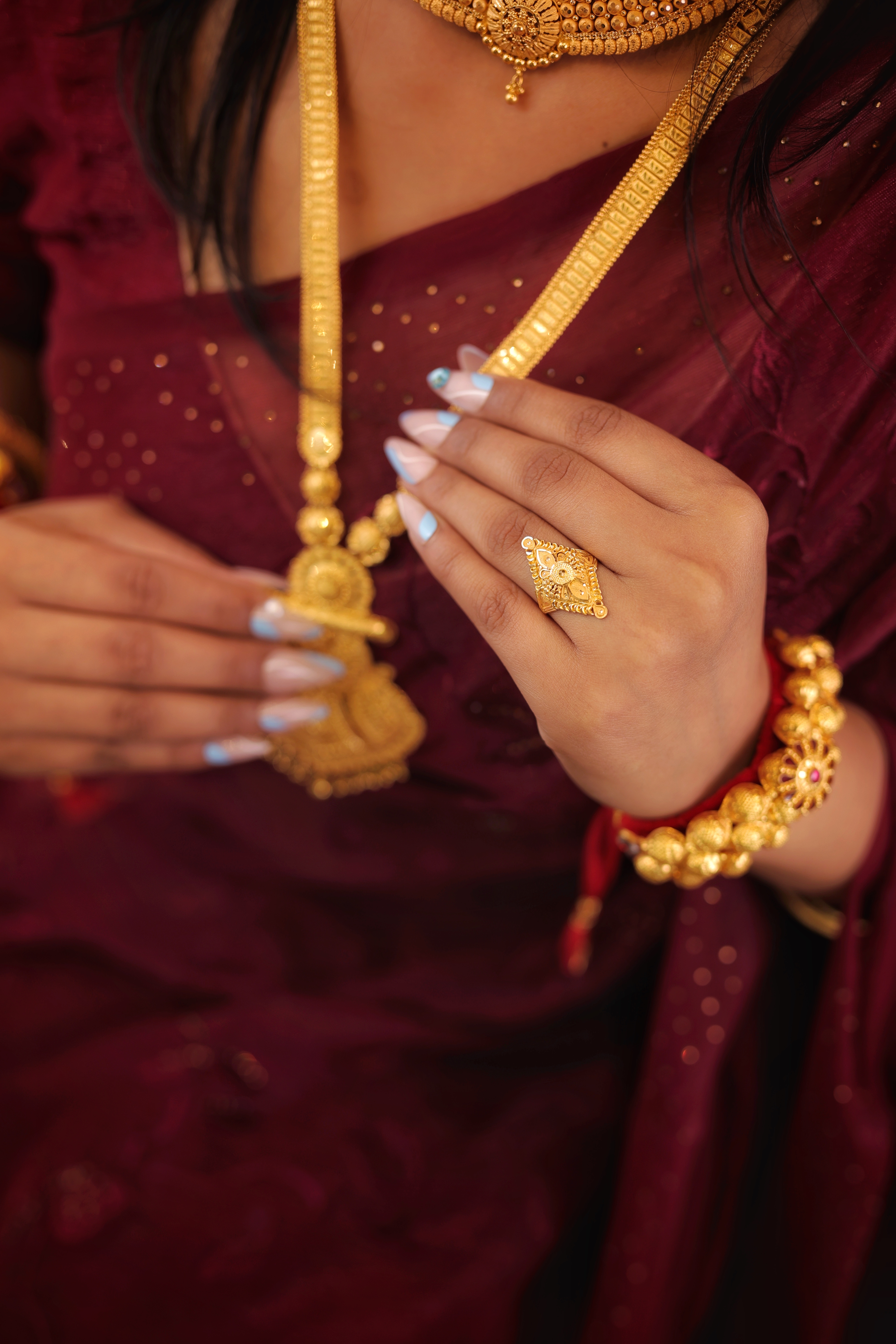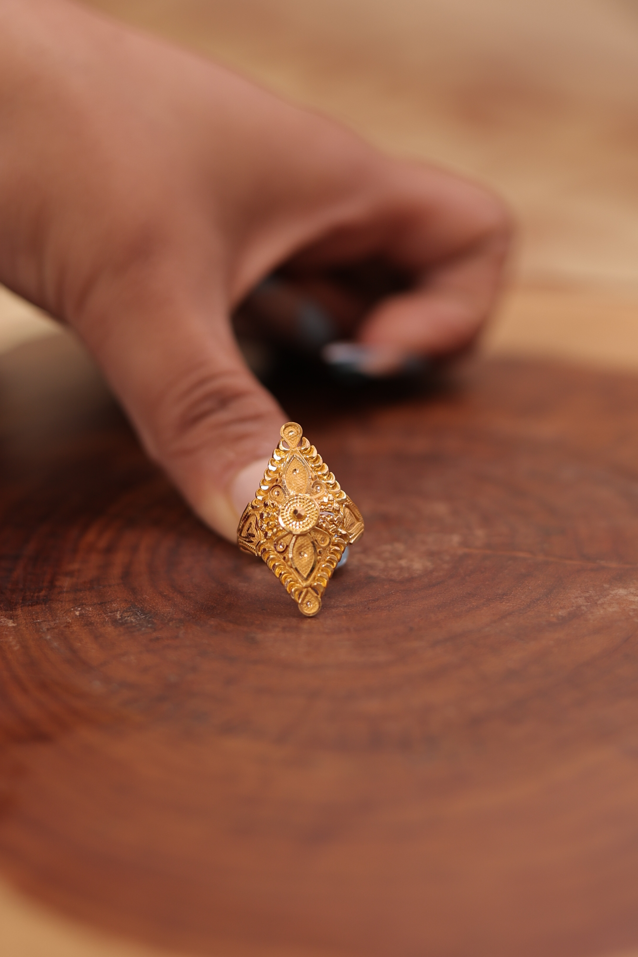 Design Highlights:Shape: Unique, elongated diamond or kite motif. Craftsmanship: Fine filigree work, granulation, and chased patterns create a luxurious texture. Metal Purity: 22 Carat Yellow Gold (Unverified, based on common traditional jewelry). Usage: Ideal for special occasions, cultural events, or as a magnificent cocktail ring.