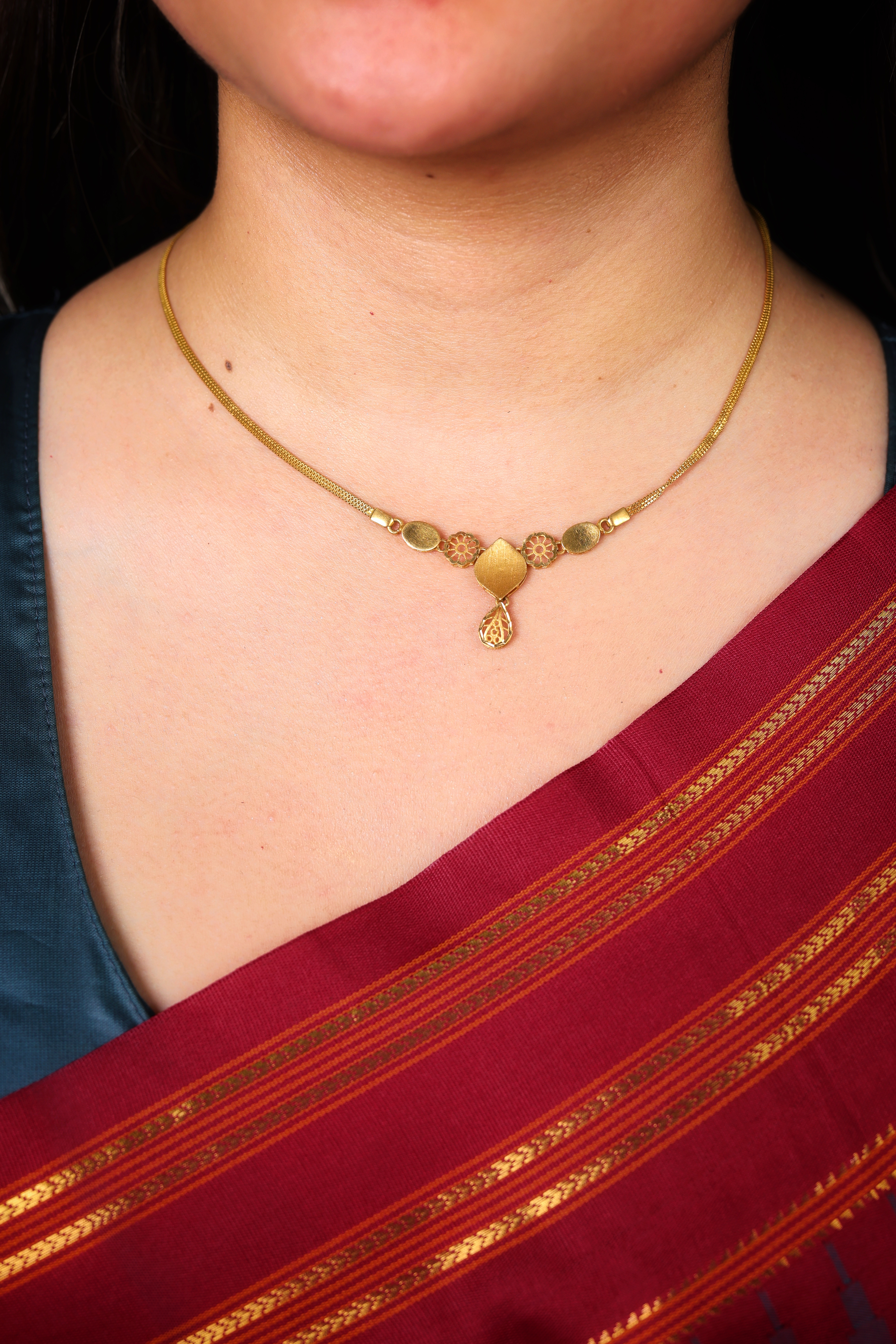 Design: Central leaf motif with side floral links integrated into the chain. Metal Purity: Assumed 22 Carat Yellow Gold (916 purity). Style: Minimalist traditional, very lightweight and subtle. Usage: Ideal for daily wear, office wear, or a thoughtful small gift.