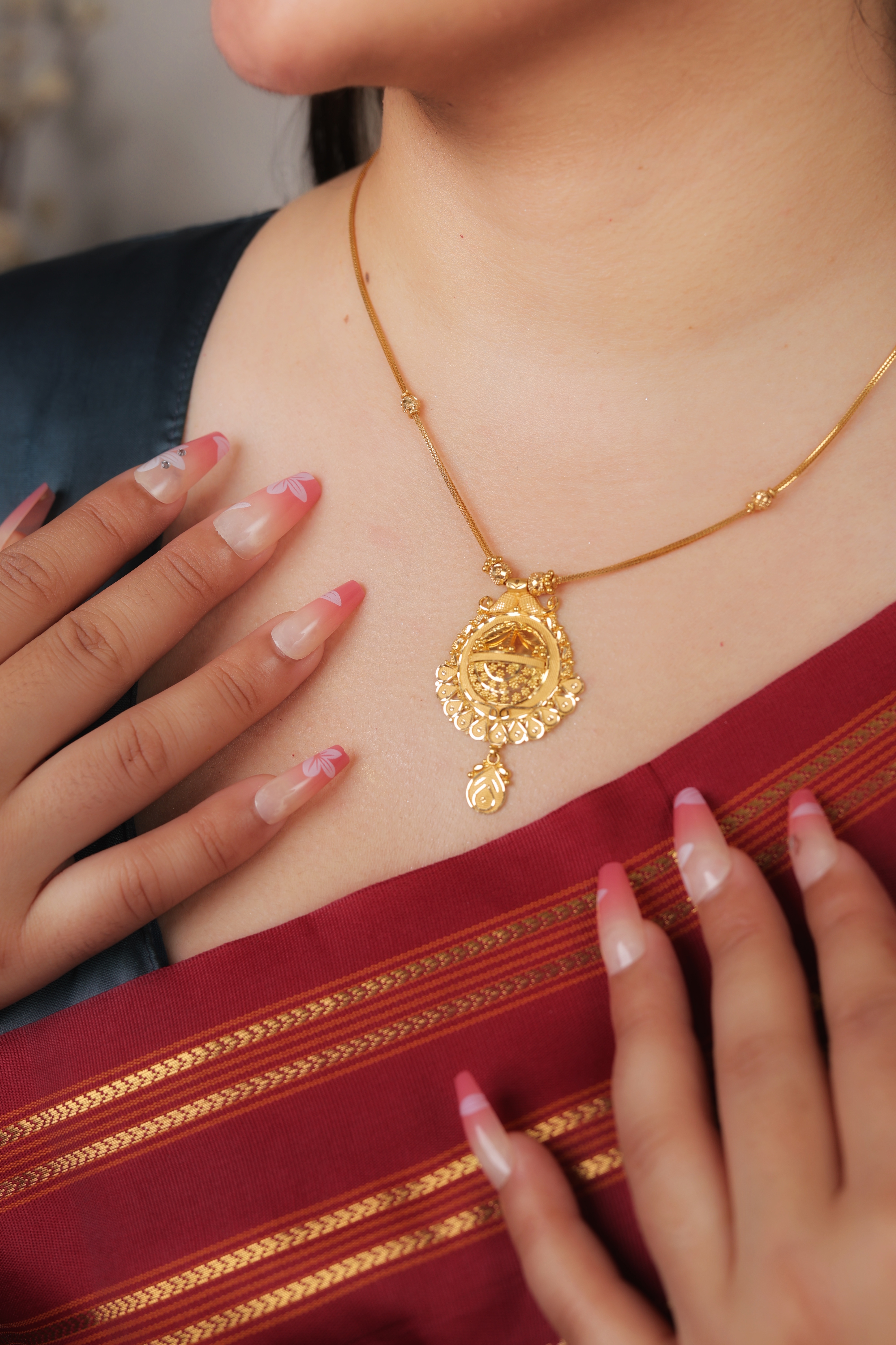 This stunning necklace showcases a highly detailed, traditional circular medallion pendant. The design centers around a beautiful floral or sun motif, surrounded by intricate filigree work that gives the piece depth and dimension. The medallion is finished with a small, delicate drop at the base and hangs from a fine chain accented with small gold beads.
