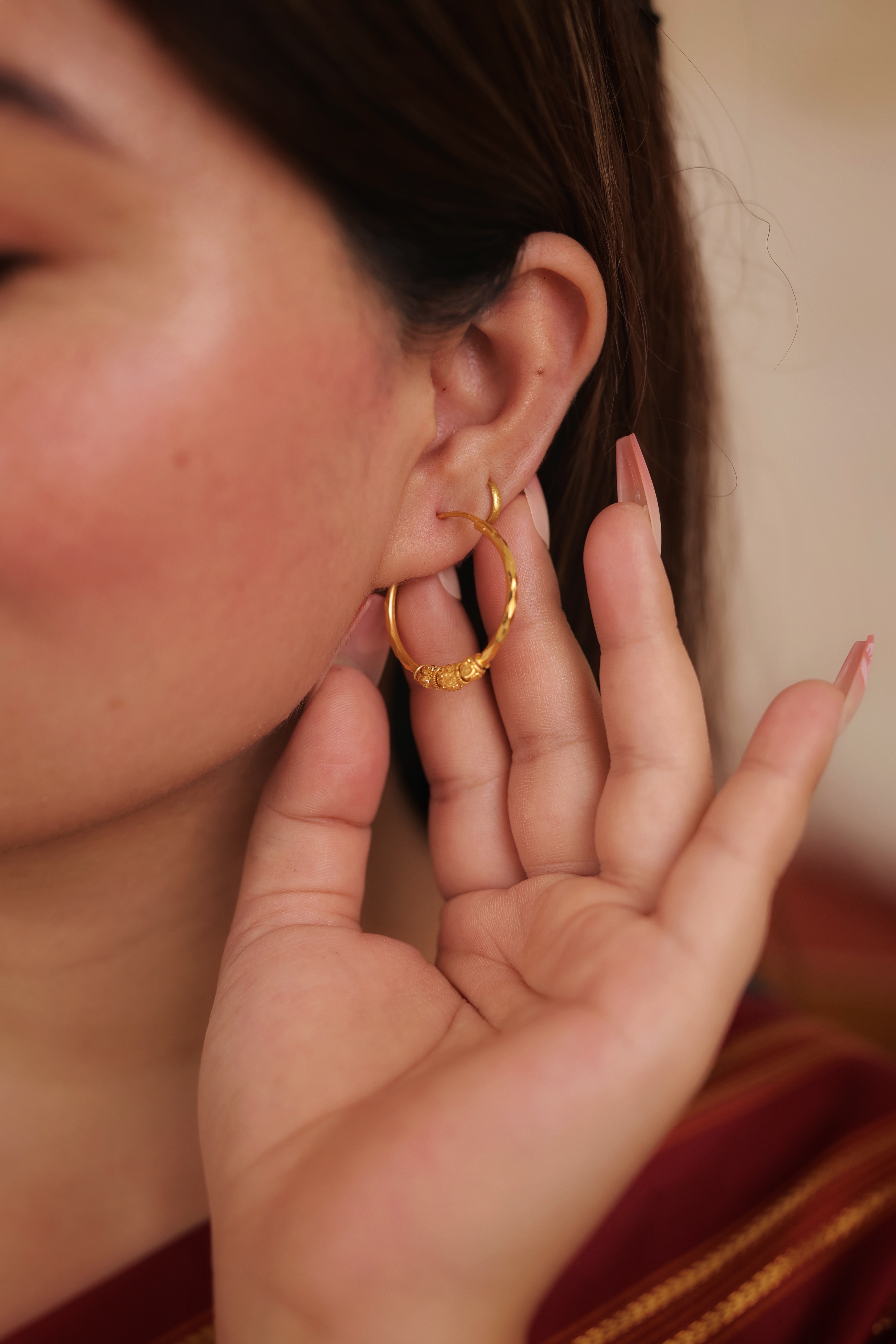 Crafted from a high-quality alloy and layered with 24K Gold plating, these earrings are gentle on the skin and incredibly comfortable for all-day wear. The subtle granular design featured on the lower part of the hoop lends it a unique and traditional touch.