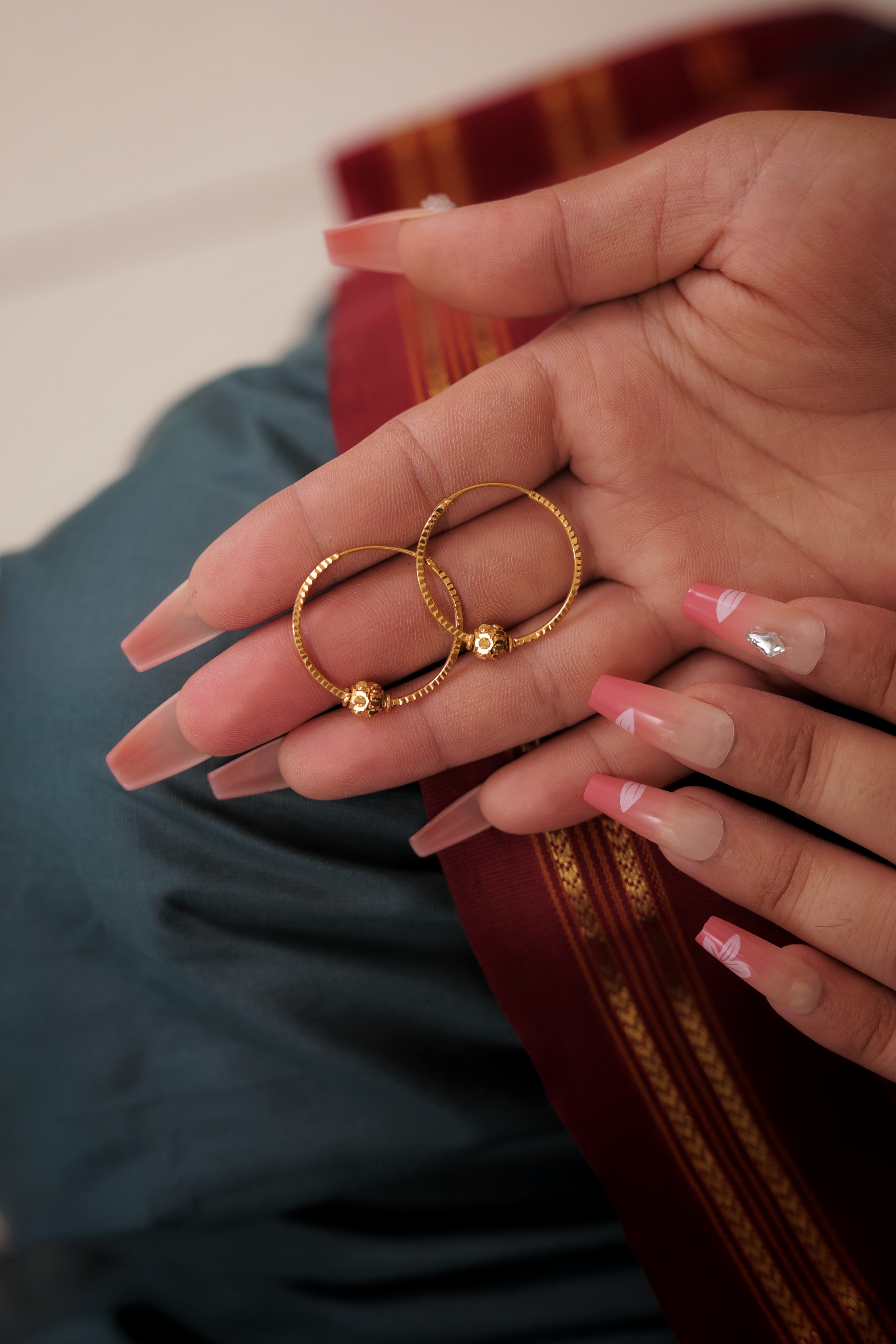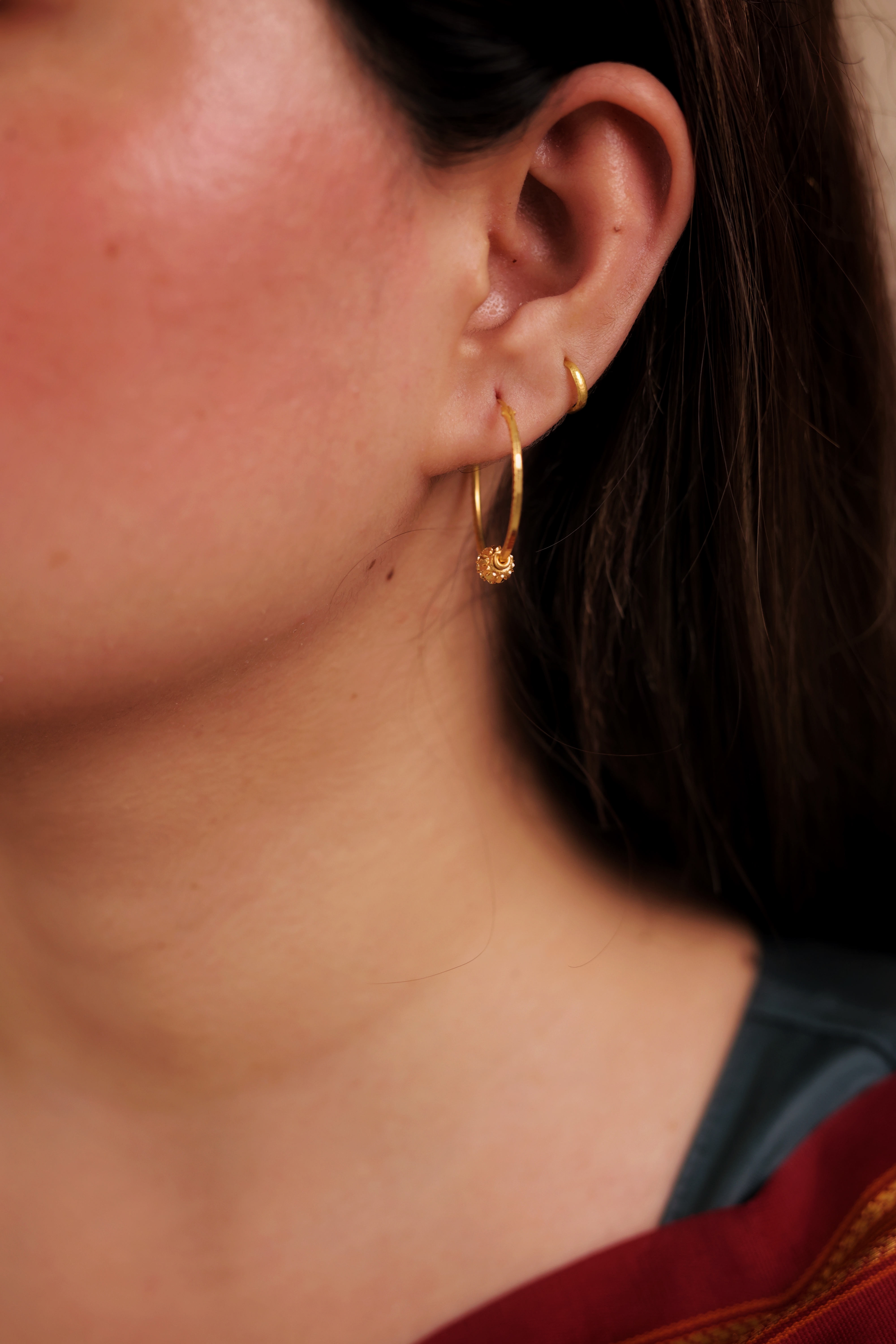 Experience the charm of traditional jewellery design scaled down for modern, comfortable wear. These gold-plated Bali hoops are designed to gently hug the earlobe, offering a secure fit that you can wear comfortably all day and night. The central element of this design is the intricate, textured beaded band, which provides a beautiful handcrafted look that subtly catches the light. Their lightweight nature makes them suitable for prolonged wear, even for those with sensitive ears.